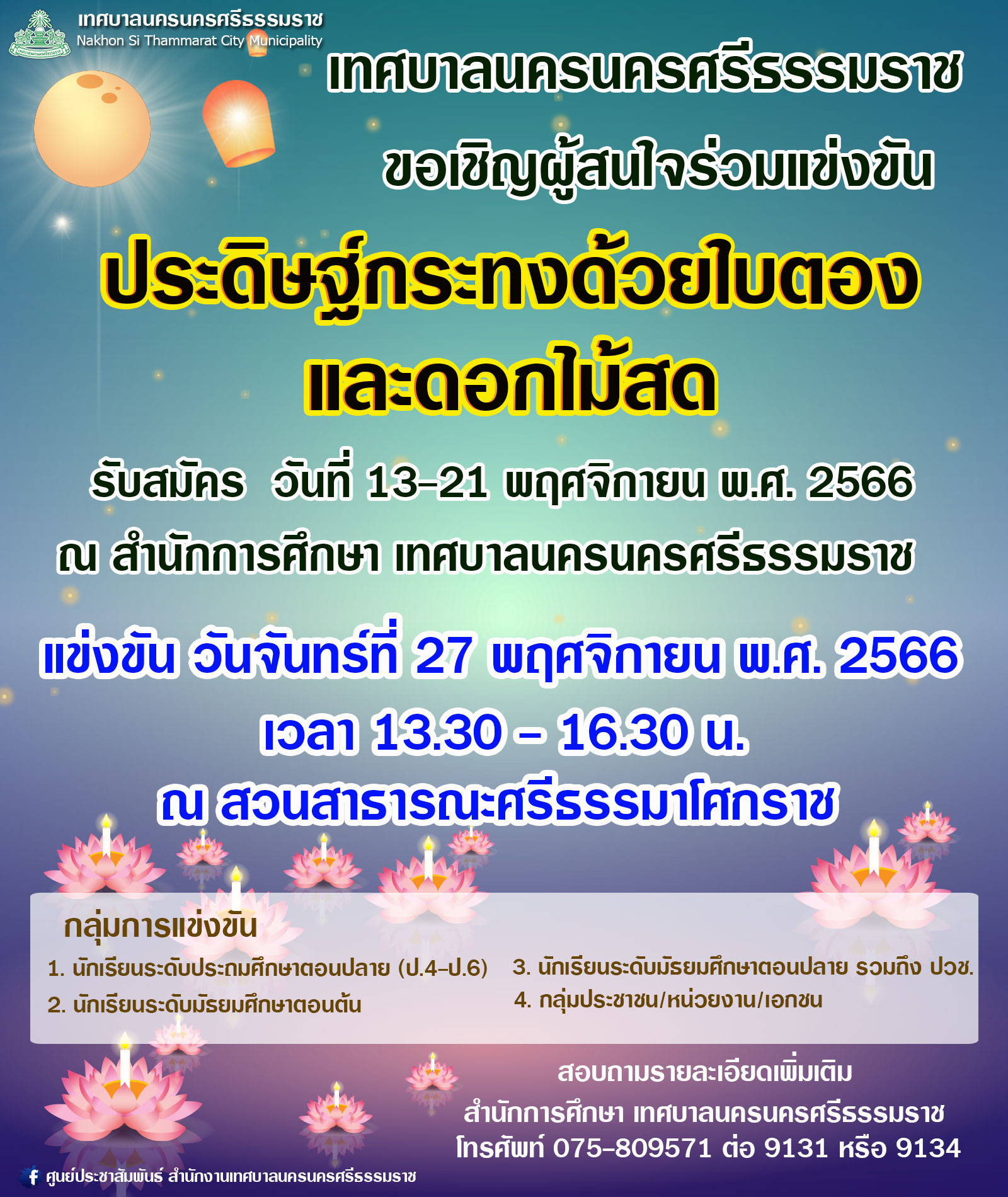 เทศบาลนครนครศรีธรรมราช ขอเชิญผู้สนใจร่วมแข่งขัน ประดิษฐ์กระทงด้วยใบตองและดอกไม้สด ในงานประเพณีลอยกระทง ประจำปี 2566 |