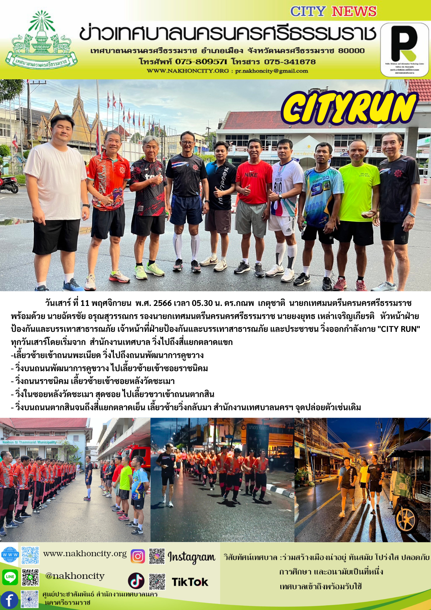 วันเสาร์ ที่ 11 พฤศจิกายน พ.ศ. 2566 เวลา 05.30 น. ดร.กณพ เกตุชาติ นายกเทศมนตรีนครนครศรีธรรมราชพร้อมด้วย นายฉัตรชัย อรุณสุวรรณกร รองนายกเทศมนตรีนครนครศรีธรรมราช นายยงยุทธ เหล่าเจริญเกียรติหัวหน้าฝ่ายป้องกันและบรรเทาสาธารณภัย เจ้าหน้าที่ฝ่ายป้องกันและบรรเทาสาธารณภัย และประชาชน วิ่งออกกำลังกาย "CITY RUN" ทุกวันเสาร์ โดยเริ่มจาก สำนักงานเทศบาล วิ่งไปถึงสี่แยกตลาดแขก -เลี้ยวซ้ายเข้าถนนพะเนียด วิ่งไปถึงถนนพัฒนาการคูขวาง - วิ่งบนถนนพัฒนาการคูขวาง ไปเลึ้ยวซ้ายเข้าซอยราชนิคม - วิ่งถนนราชนิคม เลี้ยวซ้ายเข้าซอยหลังวัดชะเมา - วิ่งในซอยหลังวัดชะเมา สุดซอย ไปเลี้ยวขวาเข้าถนนตากสิน - วิ่งบนถนนตากสินจนถึงสี่แยกตลาดเย็น เลี้ยวซ้ายวิ่งกลับมา สำนักงานเทศบาลนครฯ จุดปล่อยตัวเช่นเดิม |