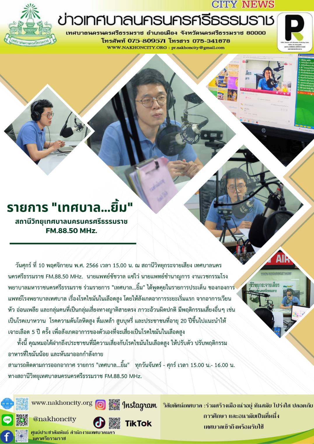 วันศุกร์ ที่ 10 พฤศจิกายน พ.ศ. 2566 เวลา 15.00 น. ณ สถานีวิทยุกระจายเสียง เทศบาลนครนครศรีธรรมราช FM.88.50 MHz. นายแพทย์ชัชวาล แซ่ไว่ นายแพทย์ชำนาญการ งานเวชกรรมโรงพยาบาลมหาราชนครศรีธรรมราช ร่วมรายการ "เทศบาล...ยิ้ม" ได้พูดคุยในรายการประเด็น ของกองการแพทย์โรงพยาบาลเทศบาล เรื่องโรคไขมันในเลือดสูง โดยให้สังเกตอาการระยะเริ่มแรก จากอาการเวียนหัว อ่อนเพลีย และกลุ่มคนที่เป็นกลุ่มเสี่ยงทางญาติสายตรง ภาวะอ้วนผิดปกติ มีพฤติกรรมเสี่ยงอื่นๆ เช่น เป็นโรคเบาหวาน โรคความดันโลหิตสูง ดื่มเหล้า สูบบุหรี่ และประชาชนที่อายุ 20 ปีขึ้นไปแนะนำให้เจาะเลือด 5 ปี ครั้ง เพื่อสังเกตอาการของตัวเองที่จะเสี่ยงเป็นโรคไขมันในเลือดสูง |