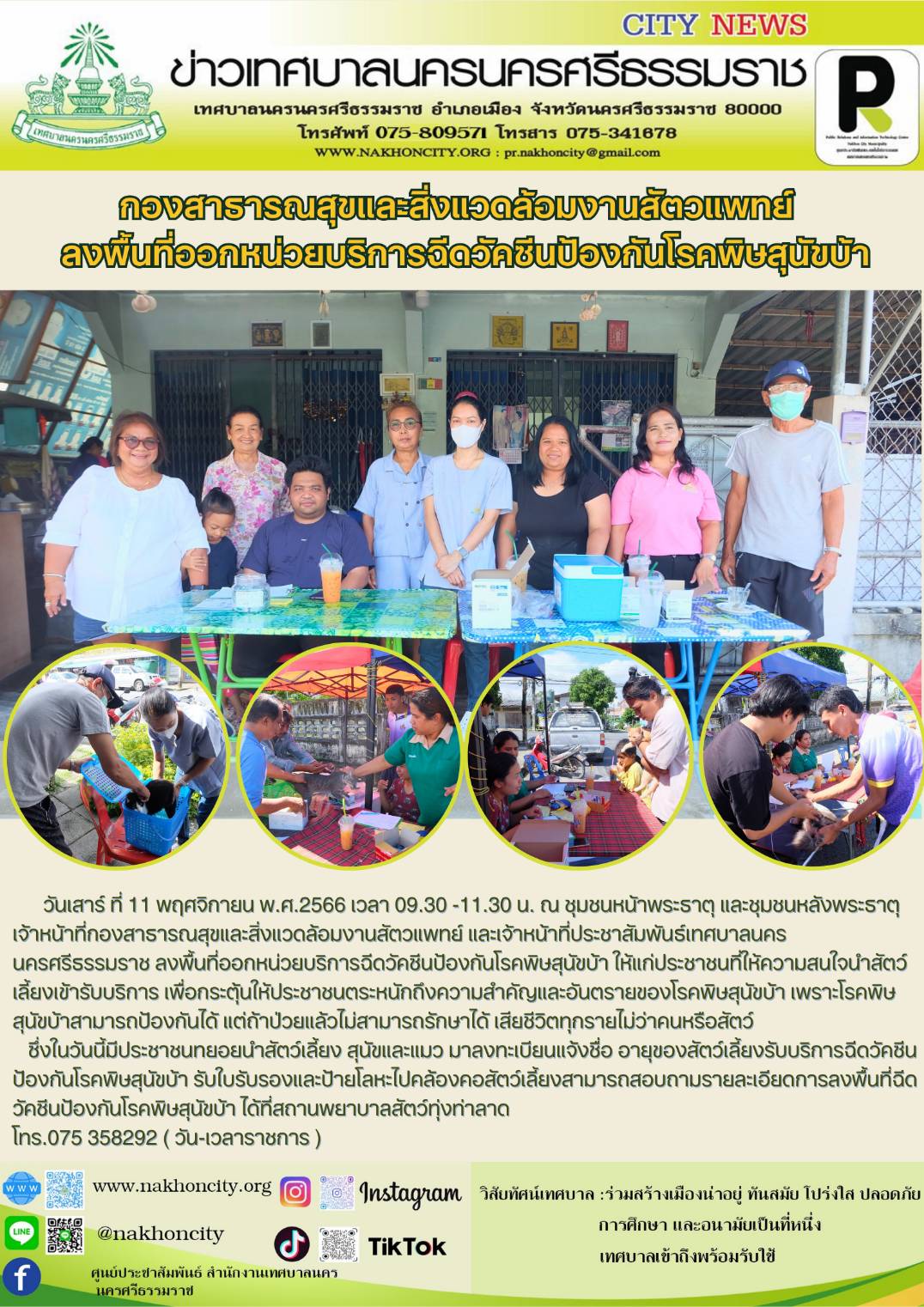 วันเสาร์ ที่ 11 พฤศจิกายน พ.ศ.2566 เวลา 09.30 -11.30 น. ณ ชุมชนหน้าพระธาตุ และชุมชนหลังพระธาตุ เจ้าหน้าที่กองสาธารณสุขและสิ่งแวดล้อมงานสัตวแพทย์ และเจ้าหน้าที่ประชาสัมพันธ์เทศบาลนครนครศรีธรรมราช ลงพื้นที่ออกหน่วยบริการฉีดวัคซีนป้องกันโรคพิษสุนัขบ้า ให้แก่ประชาชนที่ให้ความสนใจนำสัตว์เลี้ยงเข้ารับบริการ เพื่อกระตุ้นให้ประชาชนตระหนักถึงความสำคัญและอันตรายของโรคพิษสุนัขบ้า เพราะโรคพิษสุนัขบ้าสามารถป้องกันได้ แต่ถ้าป่วยแล้วไม่สามารถรักษาได้ เสียชีวิตทุกรายไม่ว่าคนหรือสัตว์ ซึ่งในวันนี้มีประชาชนทยอยนำสัตว์เลี้ยง สุนัขและแมว มาลงทะเบียนแจ้งชื่อ อายุของสัตว์เลี้ยงรับบริการฉีดวัคซีนป้องกันโรคพิษสุนัขบ้า รับใบรับรองและป้ายโลหะไปคล้องคอสัตว์เลี้ยงสามารถสอบถามรายละเอียดการลงพื้นที่ฉีดวัคซีนป้องกันโรคพิษสุนัขบ้า ได้ที่สถานพยาบาลสัตว์ทุ่งท่าลาด โทร.075 358292 ( วัน-เวลาราชการ ) ............... ภาพ//ข่าว//จันทร์จิรา |