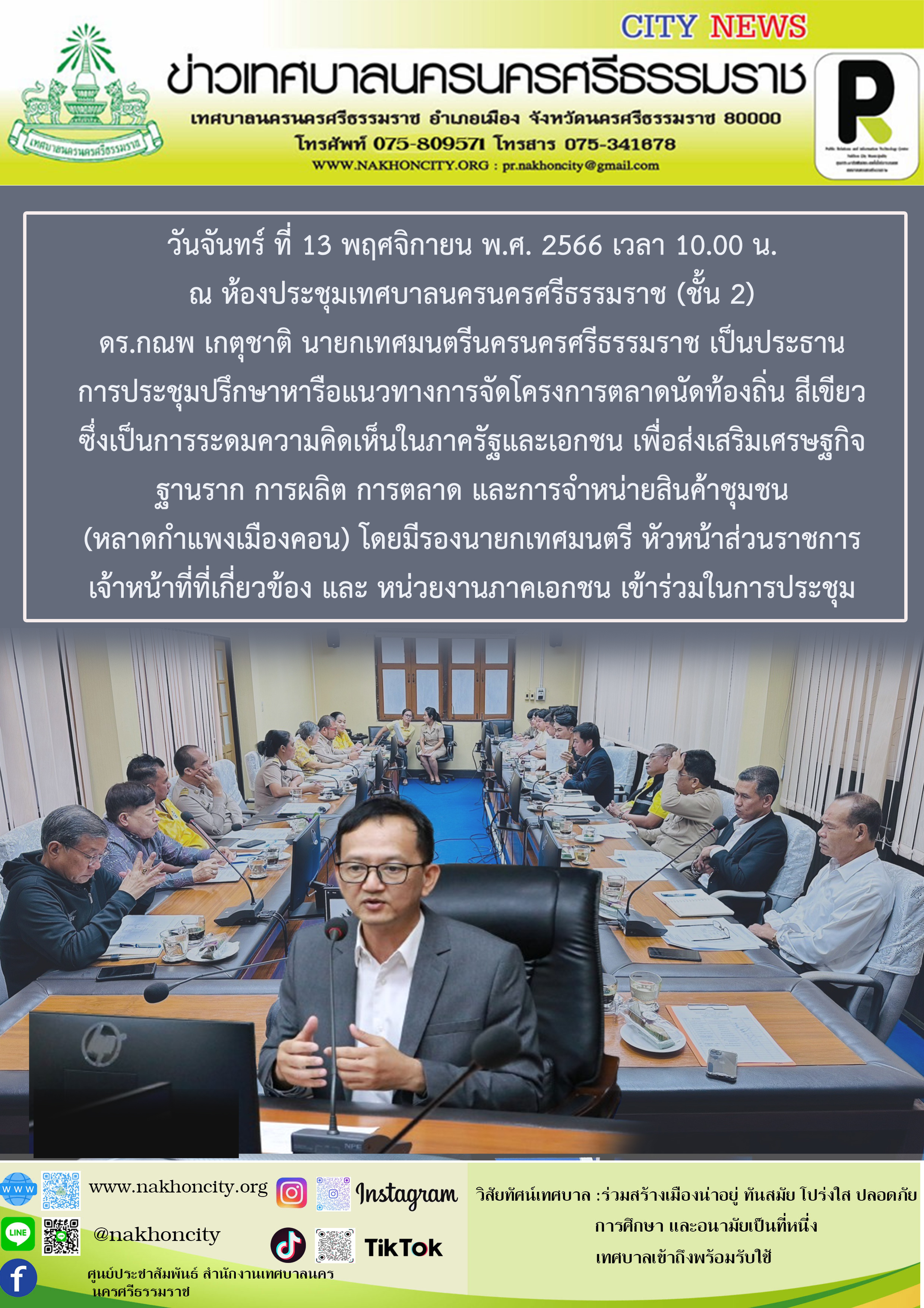 ดร.กณพ เกตุชาติ นายกเทศมนตรีนครนครศรีธรรมราช เป็นประธานการประชุมปรึกษาหารือแนวทางการจัดโครงการตลาดนัดท้องถิ่นสีเขียว |