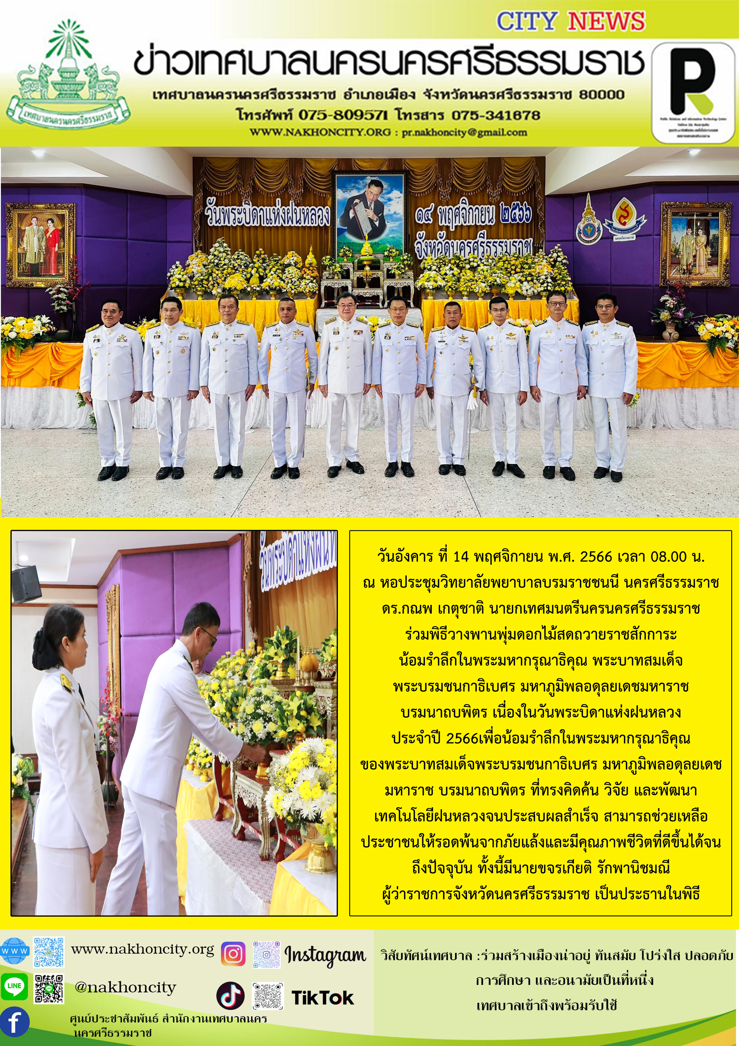 ดร.กณพ เกตุชาติ นายกเทศมนตรีนครนครศรีธรรมราช ร่วมพิธีวางพานพุ่มดอกไม้สดถวายราชสักการะ น้อมรำลึกในพระมหากรุณาธิคุณ พระบาทสมเด็จพระบรมชนกาธิเบศร มหาภูมิพลอดุลยเดชมหาราช บรมนาถบพิตร เนื่องในวันพระบิดาแห่งฝนหลวง ประจำปี 2566 |