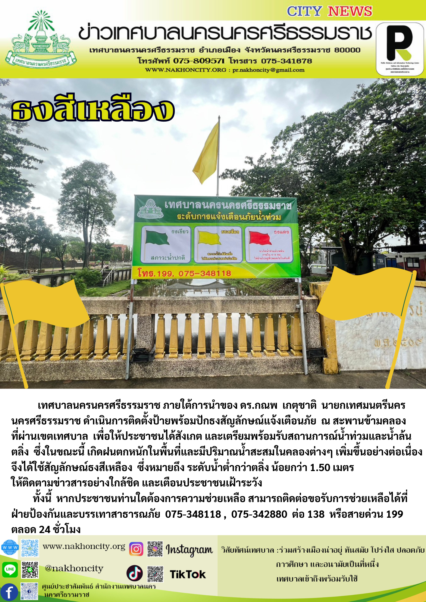 เทศบาลนครนครศรีธรรมราช ภายใต้การนำของ ดร.กณพ เกตุชาติ นายกเทศมนตรีนครนครศรีธรรมราช ดำเนินการติดตั้งป้ายพร้อมปักธงสัญลักษณ์แจ้งเตือนภัย ณ สะพานข้ามคลอง ที่ผ่านเขตเทศบาล เพื่อให้ประชาชนได้สังเกต และเตรียมพร้อมรับสถานการณ์น้ำท่วมและน้ำล้นตลิ่ง ซึ่งในขณะนี้ เกิดฝนตกหนักในพื้นที่และมีปริมาณน้ำสะสมในคลองต่างๆ เพิ่มขึ้นอย่างต่อเนื่อง จึงได้ใช้สัญลักษณ์ธงสีเหลือง ซึ่งหมายถึง ระดับน้ำต่ำกว่าตลิ่ง น้อยกว่า 1.50 เมตร ให้ติดตามข่าวสารอย่างใกล้ชิด และเตือนประชาชนเฝ้าระวัง ทั้งนี้ หากประชาชนท่านใดต้องการความช่วยเหลือ สามารถติดต่อขอรับการช่วยเหลือได้ที่ ฝ่ายป้องกันและบรรเทาสาธารณภัย 075-348118 , 075-342880 ต่อ 138 หรือสายด่วน 199 ตลอด 24 ชั่วโมง