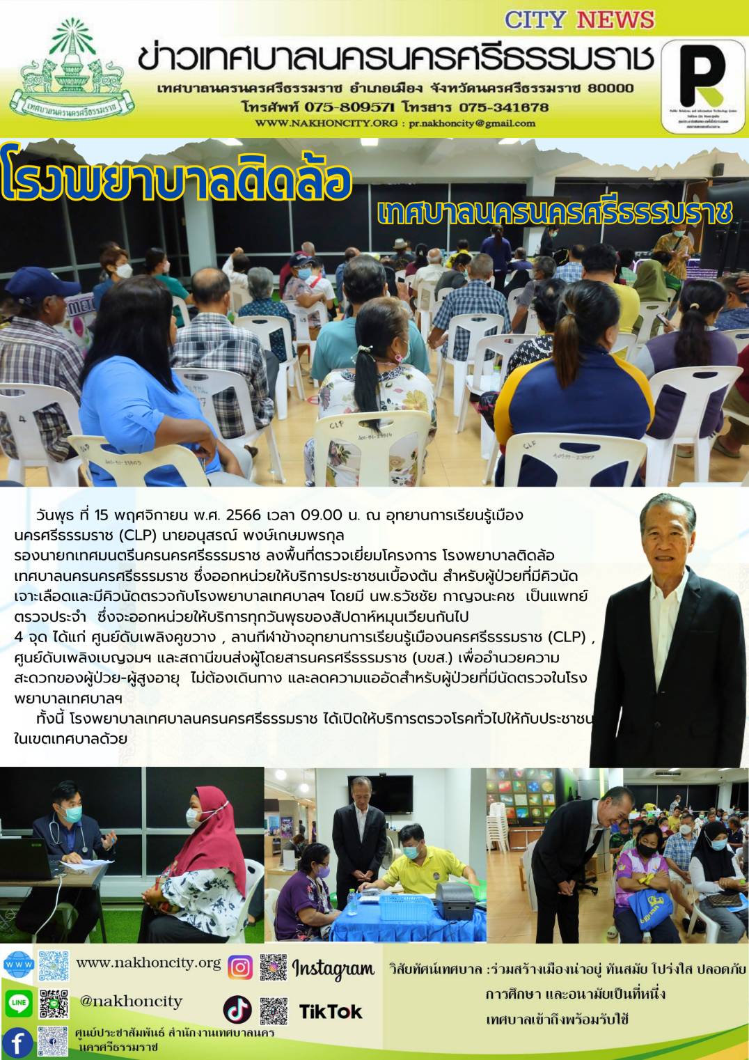 วันพุธ ที่ 15 พฤศจิกายน พ.ศ. 2566 เวลา 09.00 น. ณ อุทยานการเรียนรู้เมืองนครศรีธรรมราช (CLP) นายอนุสรณ์ พงษ์เกษมพรกุล รองนายกเทศมนตรีนครนครศรีธรรมราช ลงพื้นที่ตรวจเยี่ยมโครงการ โรงพยาบาลติดล้อ เทศบาลนครนครศรีธรรมราช ซึ่งออกหน่วยให้บริการประชาชนเบื้องต้น สำหรับผู้ป่วยที่มีคิวนัดเจาะเลือดและมีคิวนัดตรวจกับโรงพยาบาลเทศบาลฯ โดยมี นพ.ธวัชชัย กาญจนะคช เป็นแพทย์ตรวจประจำ ซึ่งจะออกหน่วยให้บริการทุกวันพุธของสัปดาห์หมุนเวียนกันไป 4 จุด ได้แก่ ศูนย์ดับเพลิงคูขวาง , ลานกีฬาข้างอุทยานการเรียนรู้เมืองนครศรีธรรมราช (CLP) , |