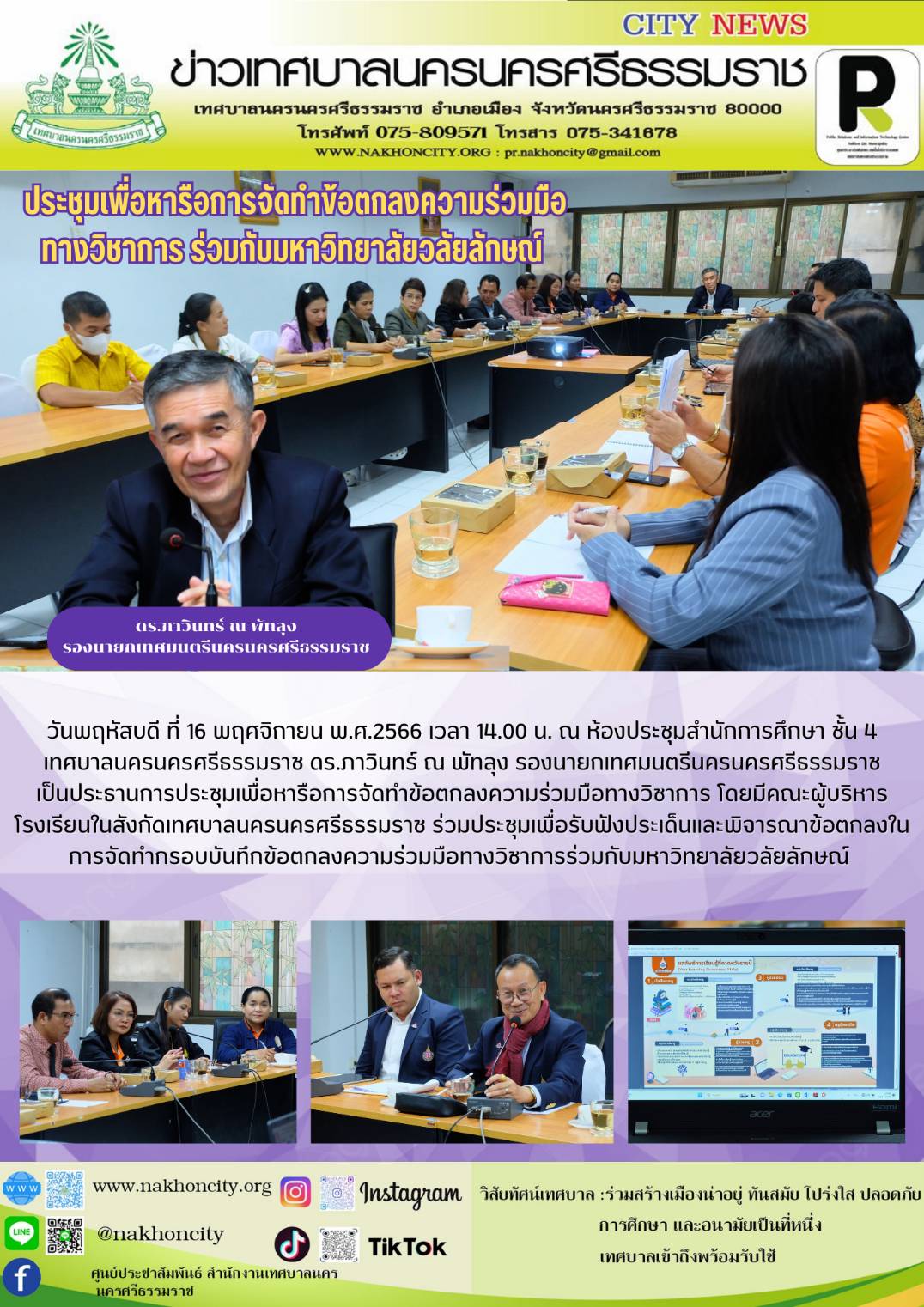 ดร.ภาวินทร์ ณ พัทลุง รองนายกเทศมนตรีนครนครศรีธรรมราช เป็นประธานการประชุมเพื่อหารือการจัดทำข้อตกลงความร่วมมือทางวิชาการ |