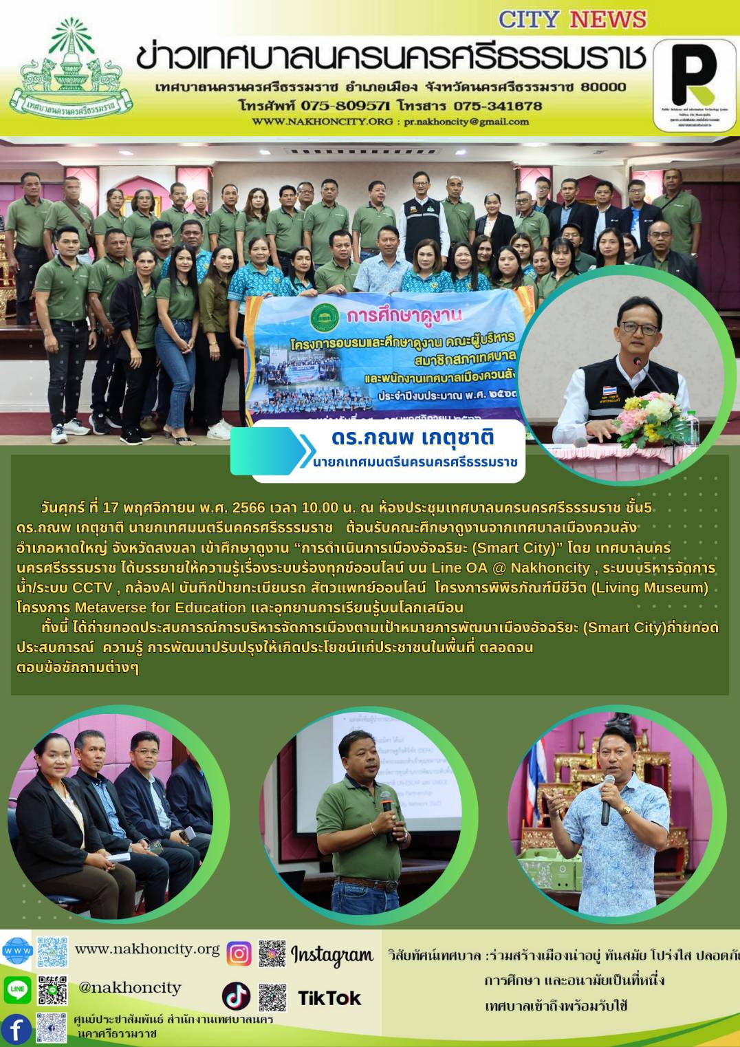 วันศุกร์ ที่ 17 พฤศจิกายน พ.ศ. 2566 เวลา 10.00 น. ณ ห้องประชุมเทศบาลนครนครศรีธรรมราช ชั้น5 ดร.กณพ เกตุชาติ นายกเทศมนตรีนคครศรีธรรมราช ต้อนรับคณะศึกษาดูงานจากเทศบาลเมืองควนลัง อำเภอหาดใหญ่ จังหวัดสงขลา เข้าศึกษาดูงาน “การดำเนินการเมืองอัจฉริยะ (Smart City)” โดย เทศบาลนครนครศรีธรรมราช ได้บรรยายให้ความรู้เรื่องระบบร้องทุกข์ออนไลน์ บน Line OA @ Nakhoncity , ระบบบริหารจัดการน้ำ/ระบบ CCTV , กล้องAI บันทึกป้ายทะเบียนรถ สัตวแพทย์ออนไลน์ โครงการพิพิธภัณฑ์มีชีวิต (Living Museum) โครงการ Metaverse for Education และอุทยานการเรียนรู้บนโลกเสมือน |