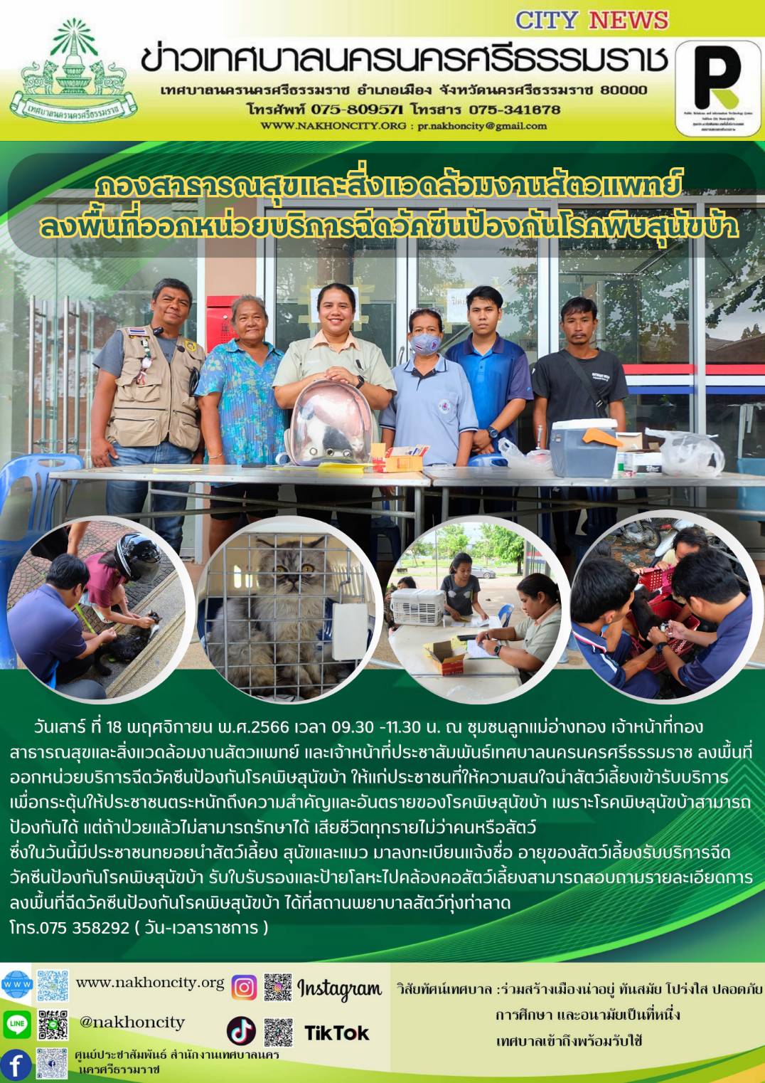 วันเสาร์ ที่ 18 พฤศจิกายน พ.ศ.2566 เวลา 09.30 -11.30 น. ณ ชุมชนลูกแม่อ่างทอง เจ้าหน้าที่กองสาธารณสุขและสิ่งแวดล้อมงานสัตวแพทย์ และเจ้าหน้าที่ประชาสัมพันธ์เทศบาลนครนครศรีธรรมราช ลงพื้นที่ออกหน่วยบริการฉีดวัคซีนป้องกันโรคพิษสุนัขบ้า ให้แก่ประชาชนที่ให้ความสนใจนำสัตว์เลี้ยงเข้ารับบริการ เพื่อกระตุ้นให้ประชาชนตระหนักถึงความสำคัญและอันตรายของโรคพิษสุนัขบ้า เพราะโรคพิษสุนัขบ้าสามารถป้องกันได้ แต่ถ้าป่วยแล้วไม่สามารถรักษาได้ เสียชีวิตทุกรายไม่ว่าคนหรือสัตว์ ซึ่งในวันนี้มีประชาชนทยอยนำสัตว์เลี้ยง สุนัขและแมว มาลงทะเบียนแจ้งชื่อ อายุของสัตว์เลี้ยงรับบริการฉีดวัคซีนป้องกันโรคพิษสุนัขบ้า รับใบรับรองและป้ายโลหะไปคล้องคอสัตว์เลี้ยงสามารถสอบถามรายละเอียดการลงพื้นที่ฉีดวัคซีนป้องกันโรคพิษสุนัขบ้า ได้ที่สถานพยาบาลสัตว์ทุ่งท่าลาด โทร.075 358292 ( วัน-เวลาราชการ ) ............... ภาพ//ข่าว//จันทร์จิรา |