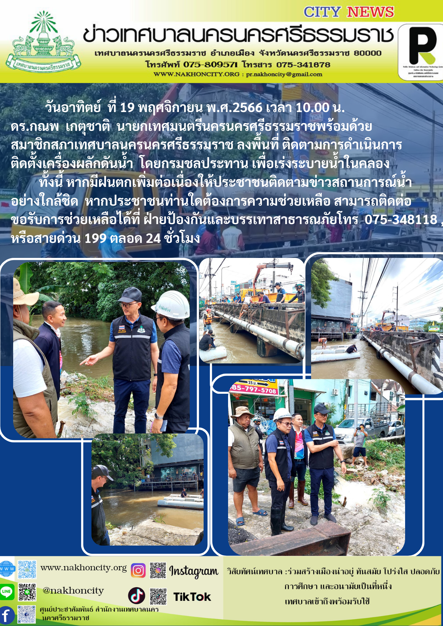 วันอาทิตย์ ที่ 19 พฤศจิกายน พ.ศ.2566 เวลา 10.00 น. ดร.กณพ เกตุชาติ นายกเทศมนตรีนครนครศรีธรรมราชพร้อมด้วย สมาชิกสภาเทศบาลนครนครศรีธรรมราช ลงพื้นที่ ติดตามการดำเนินการติดตั้งเครื่องผลักดันน้ำ โดยกรมชลประทาน เพื่อเร่งระบายน้ำในคลอง ทั้งนี้ หากมีฝนตกเพิ่มต่อเนื่องให้ประชาชนติดตามข่าวสถานการณ์น้ำใกล้ชิด หากประชาชนท่านใดต้องการความช่วยเหลือ สามารถติดต่อขอรับการช่วยเหลือได้ที่ ฝ่ายป้องกันและบรรเทาสาธารณภัย 075-348118 หรือสายด่วน199 ตลอด 24 ชั่วโมง |