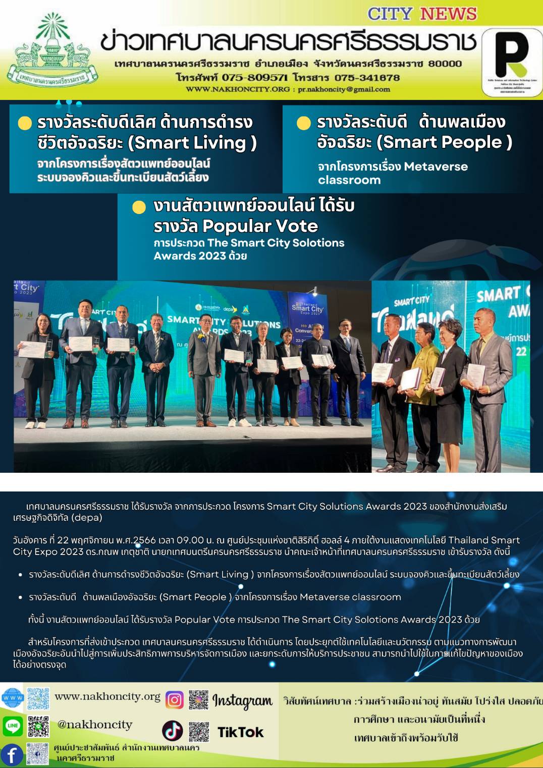 เทศบาลนครนครศรีธรรมราช ได้รับรางวัล จากการประกวด โครงการ Smart City Solutions Awards 2023 ของสํานักงานส่งเสริมเศรษฐกิจดิจิทัล (depa) |