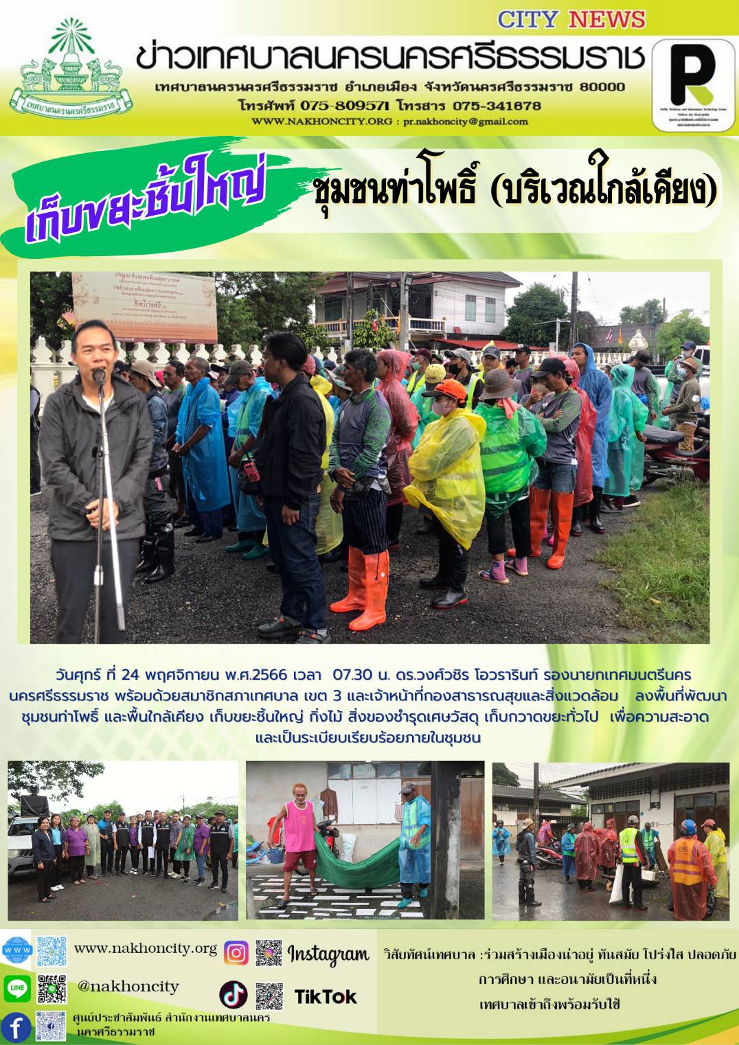 วันศุกร์ ที่ 24 พฤศจิกายน พ.ศ.2566 เวลา 07.30 น. ดร.วงศ์วชิร โอวรารินท์ รองนายกเทศมนตรีนครนครศรีธรรมราช พร้อมด้วยสมาชิกสภาเทศบาล เขต 3 และเจ้าหน้าที่กองสาธารณสุขและสิ่งแวดล้อม ลงพื้นที่พัฒนาชุมชนท่าโพธิ์ และพื้นใกล้เคียง เก็บขยะชิ้นใหญ่ กิ่งไม้ สิ่งของชำรุดเศษวัสดุ เก็บกวาดขยะทั่วไป เพื่อความสะอาด และเป็นระเบียบเรียบร้อยภายในชุมชน |