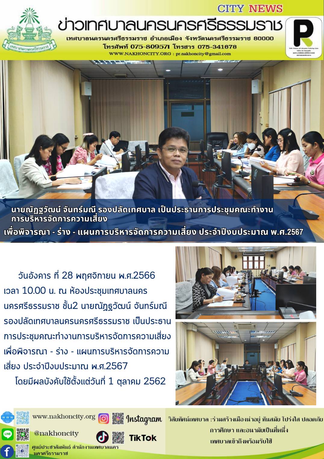 วันอังคาร ที่ 28 พฤศจิกายน พ.ศ.2566 เวลา 10.00 น. ณ ห้องประชุมเทศบาลนครนครศรีธรรมราช ชั้น2 นายณัฏฐวัฒน์ จันทร์มณี รองปลัดเทศบาลนครนครศรีธรรมราช เป็นประธานการประชุมคณะทำงานการบริหารจัดการความเสี่ยง เพื่อพิจารณา - ร่าง - แผนการบริหารจัดการความเสี่ยง ประจำปีงบประมาณ พ.ศ.2567 โดยมีผลบังคับใช้ตั้งแต่วันที่ 1 ตุลาคม 2562 .......... ภาพข่าว//จันทร์จิรา |