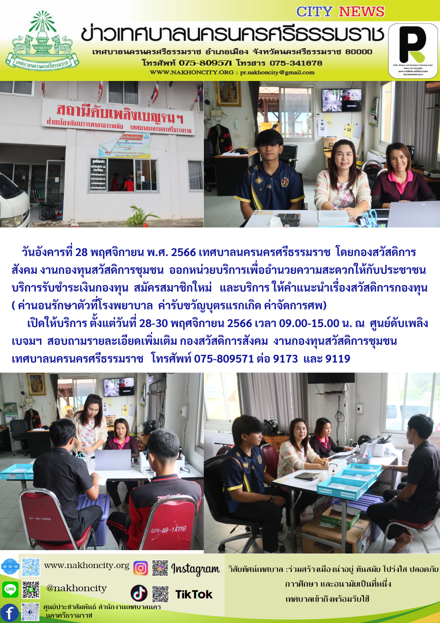 เทศบาลนครนครศรีธรรมราช โดยกองสวัสดิการสังคม งานกองทุนสวัสดิการชุมชน ออกหน่วยบริการเพื่ออำนวยความสะดวกให้กับประชาชน บริการรับชำระเงินกองทุน สมัครสมาชิกใหม่ และบริการ ให้คำแนะนำเรื่องสวัสดิการกองทุน |