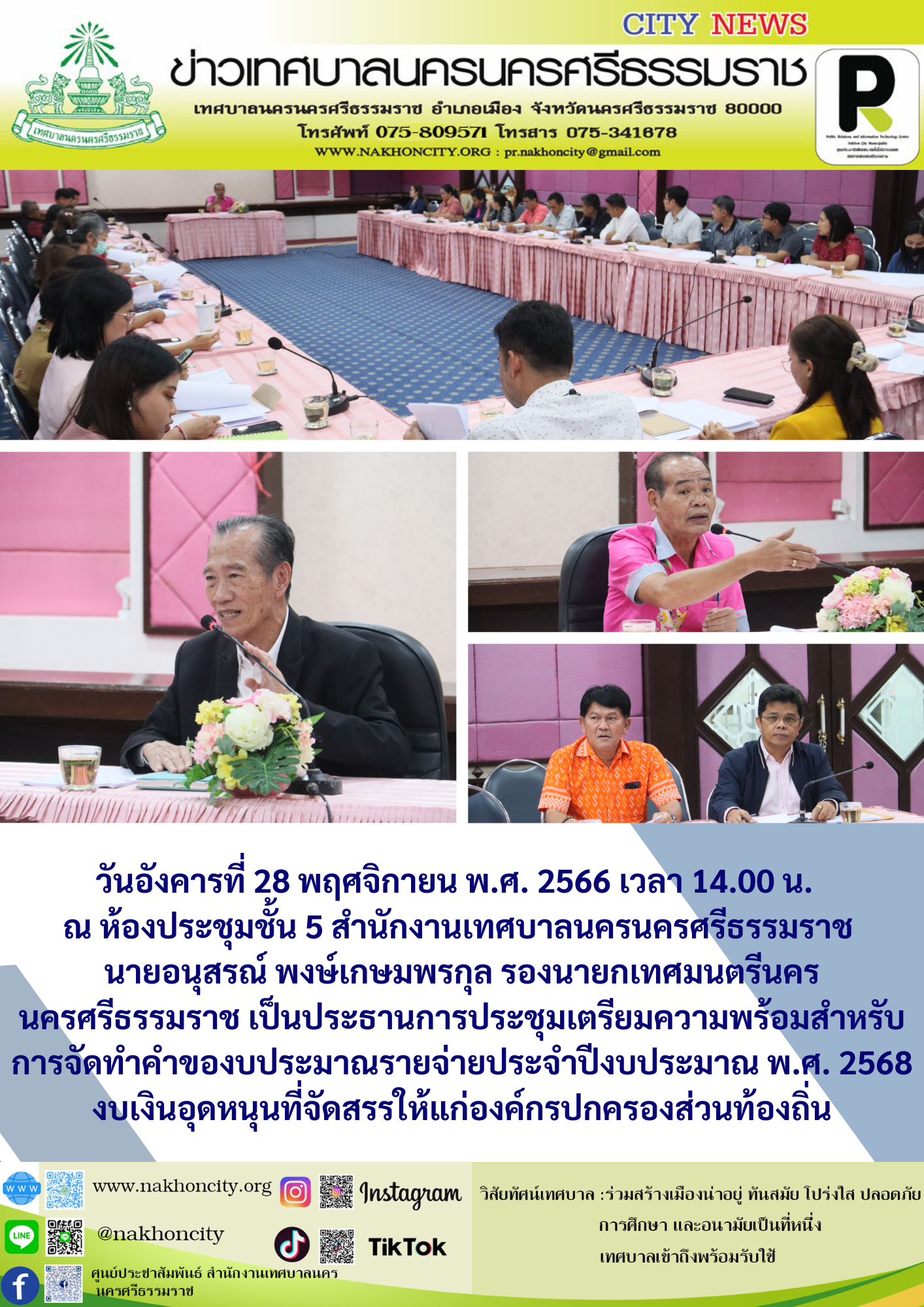 วันอังคารที่ 28 พฤศจิกายน พ.ศ. 2566 เวลา 14.00 น. ณ ห้องประชุมชั้น 5 สำนักงานเทศบาลนครนครศรีธรรมราช นายอนุสรณ์ พงษ์เกษมพรกุล รองนายกเทศมนตรีนครนครศรีธรรมราช เป็นประธานการประชุมเตรียมความพร้อมสำหรับการจัดทำคำของบประมาณรายจ่ายประจำปีงบประมาณ พ.ศ. 2568 งบเงินอุดหนุนที่จัดสรรให้แก่องค์กรปกครองส่วนท้องถิ่น |