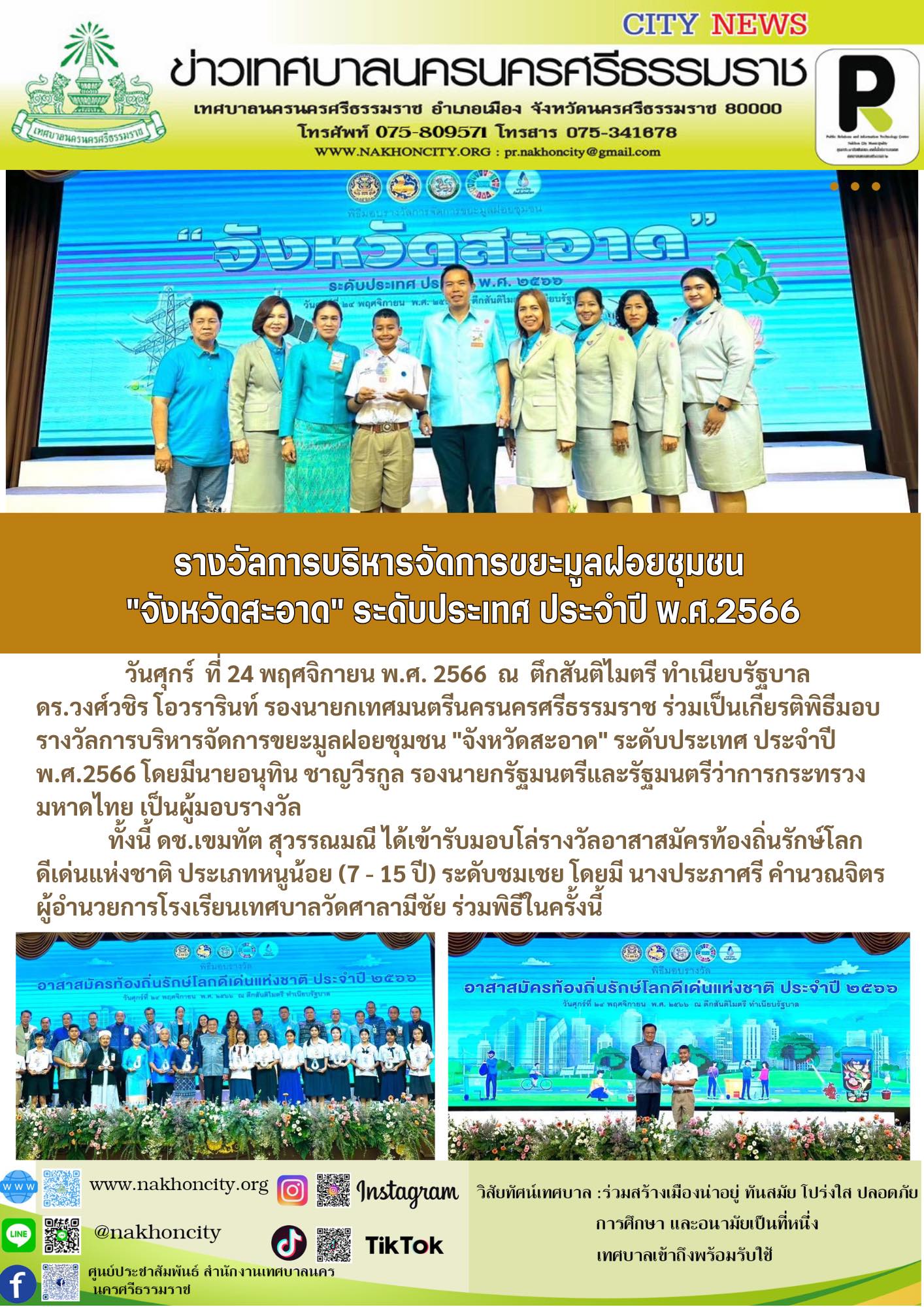 ดร.วงศ์วชิร โอวรารินท์ รองนายกเทศมนตรีนครนครศรีธรรมราช ร่วมเป็นเกียรติพิธีมอบรางวัลการบริหารจัดการขยะมูลฝอยชุมชน "จังหวัดสะอาด" ระดับประเทศ ประจำปี พ.ศ.2566 โดยมีนายอนุทิน ชาญวีรกูล รองนายกรัฐมนตรีและรัฐมนตรีว่าการกระทรวงมหาดไทย เป็นผู้มอบรางวัล |