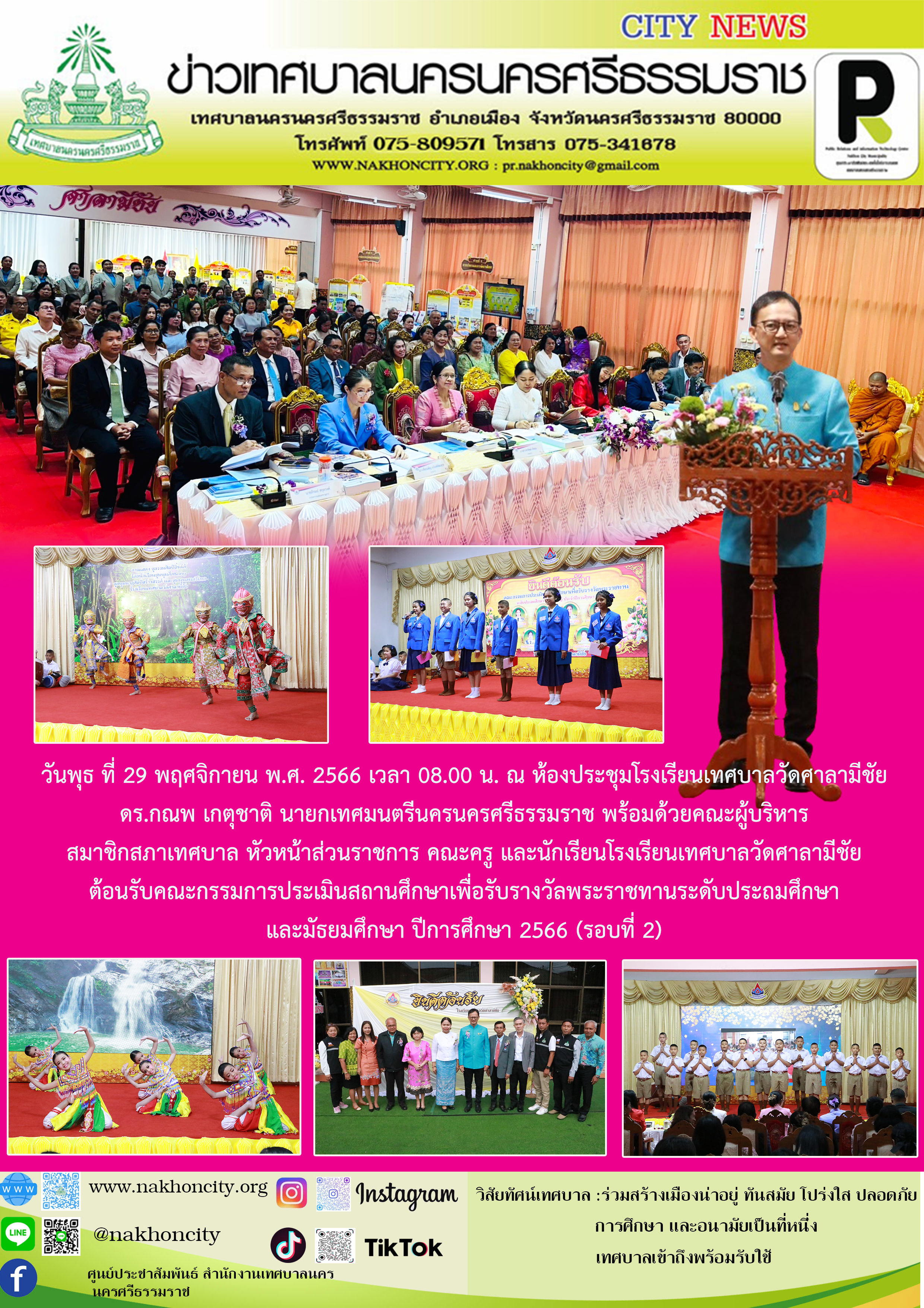 ดร.กณพ เกตุชาติ นายกเทศมนตรีนครนครศรีธรรมราช พร้อมด้วยคณะผู้บริหาร สมาชิกสภาเทศบาล หัวหน้าส่วนราชการ คณะครู และนักเรียนโรงเรียนเทศบาลวัดศาลามีชัย ต้อนรับคณะกรรมการประเมินสถานศึกษาเพื่อรับรางวัลพระราชทานระดับประถมศึกษาและมัธยมศึกษา ปีการศึกษา 2566 (รอบที่ 2) |