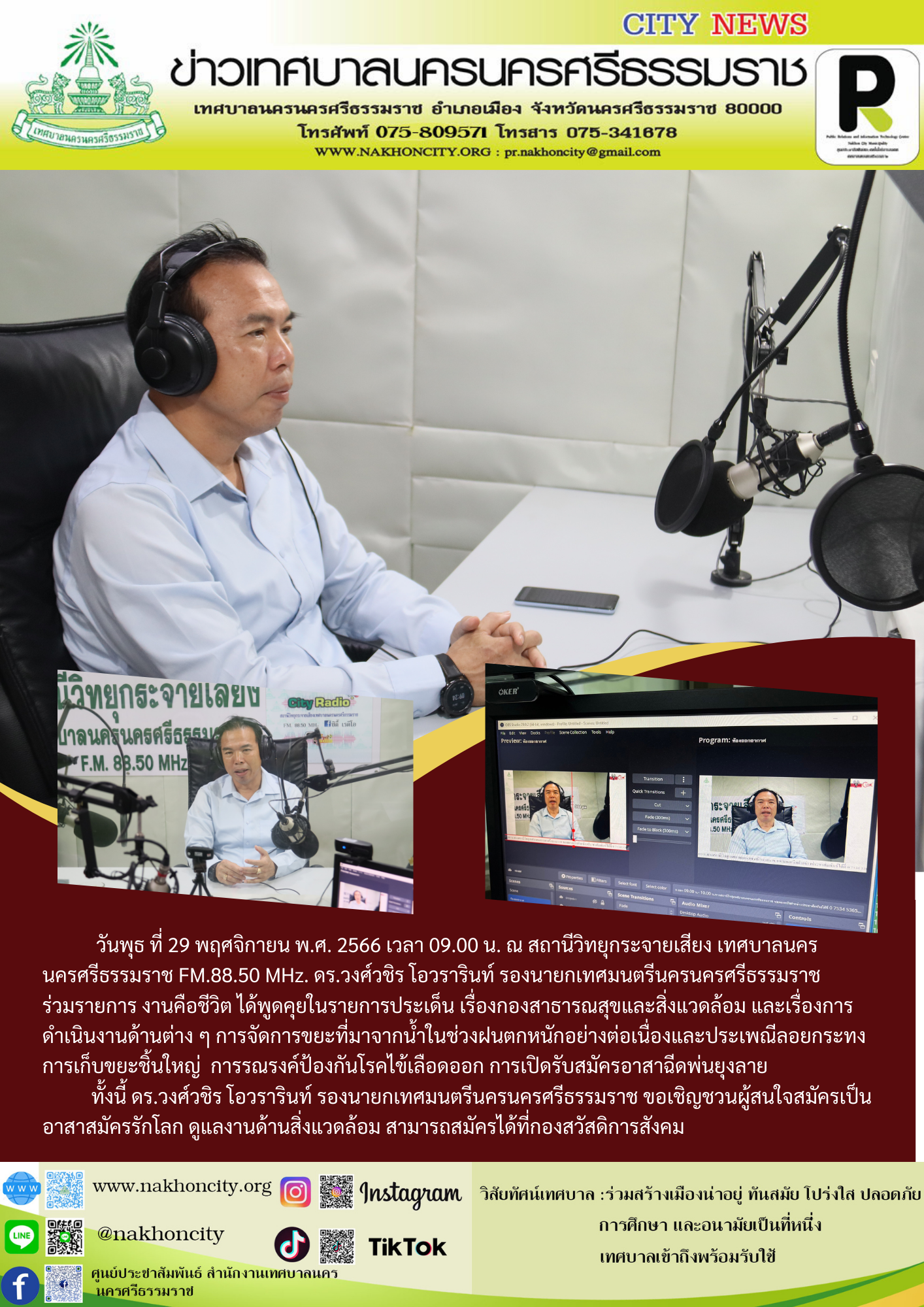 ดร.วงศ์วชิร โอวรารินท์ รองนายกเทศมนตรีนครนครศรีธรรมราช ร่วมรายการ งานคือชีวิต ผ่านทาง ณ สถานีวิทยุกระจายเสียง เทศบาลนครนครศรีธรรมราช FM.88.50 MHz. |