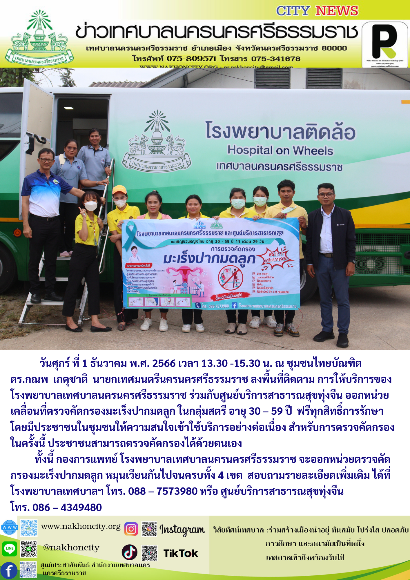 ดร.กณพ เกตุชาติ นายกเทศมนตรีนครนครศรีธรรมราช ลงพื้นที่ติดตาม การให้บริการของโรงพยาบาลเทศบาลนครนครศรีธรรมราช ร่วมกับศูนย์บริการสาธารณสุขทุ่งจีน ออกหน่วยเคลื่อนที่ตรวจคัดกรองมะเร็งปากมดลูก ณ ชุมชนไทยบัณฑิต |