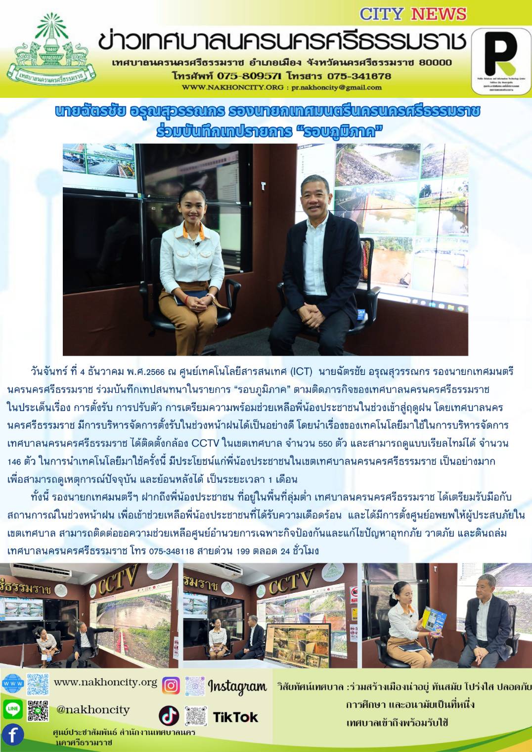 วันจันทร์ ที่ 4 ธันวาคม พ.ศ.2566 ณ ศูนย์เทคโนโลยีสารสนเทศ (ICT) นายฉัตรชัย อรุณสุวรรณกร รองนายกเทศมนตรีนครนครศรีธรรมราช ร่วมบันทึกเทปสนทนาในรายการ “รอบภูมิภาค” ตามติดภารกิจของเทศบาลนครนครศรีธรรมราช ในประเด็นเรื่อง การตั้งรับ การปรับตัว การเตรียมความพร้อมช่วยเหลือพี่น้องประชาชนในช่วงเข้าสู่ฤดูฝน โดยเทศบาลนครนครศรีธรรมราช มีการบริหารจัดการตั้งรับในช่วงหน้าฝนได้เป็นอย่างดี โดยนำเรื่องของเทคโนโลยีมาใช้ในการบริหารจัดการ เทศบาลนครนครศรีธรรมราช ได้ติดตั้งกล้อง CCTV ในเขตเทศบาล จำนวน 550 ตัว และสามารถดูแบบเรียลไทม์ได้จำนวน 146 ตัว ในการนำเทคโนโลยีมาใช้ครั้งนี้ มีประโยชน์แก่พี่น้องประชาชนในเขตเทศบาลนครนครศรีธรรมราช เป็นอย่างมาก เพื่อสามารถดูเหตุการณ์ปัจจุบัน และย้อนหลังได้ เป็นระยะเวลา 1 เดือน ทั้งนี้ รองนายกเทศมนตรีฯ ฝากถึงพี่น้องประชาชน ที่อยู่ในพื้นที่ลุ่มต่ำ เทศบาลนครนครศรีธรรมราช ได้เตรียมรับมือกับสถานการณ์ในช่วงหน้าฝน เพื่อเข้าช่วยเหลือพี่น้องประชาชนที่ได้รับความเดือดร้อน และได้มีการตั้งศูนย์อพยพให้ผู้ประสบภัยในเขตเทศบาล สามารถติดต่อขอความช่วยเหลือศูนย์อำนวยการเฉพาะกิจป้องกันและแก้ไขปัญหาอุทกภัย วาตภัย และดินถล่ม เทศบาลนครนครศรีธรรมราช โทร 075-348118 สายด่วน 199 ตลอด 24 ชั่วโมง .............. ภาพ//ข่าว//จันทร์จิรา ตรวจทาน//ฐิตินันท์ |
