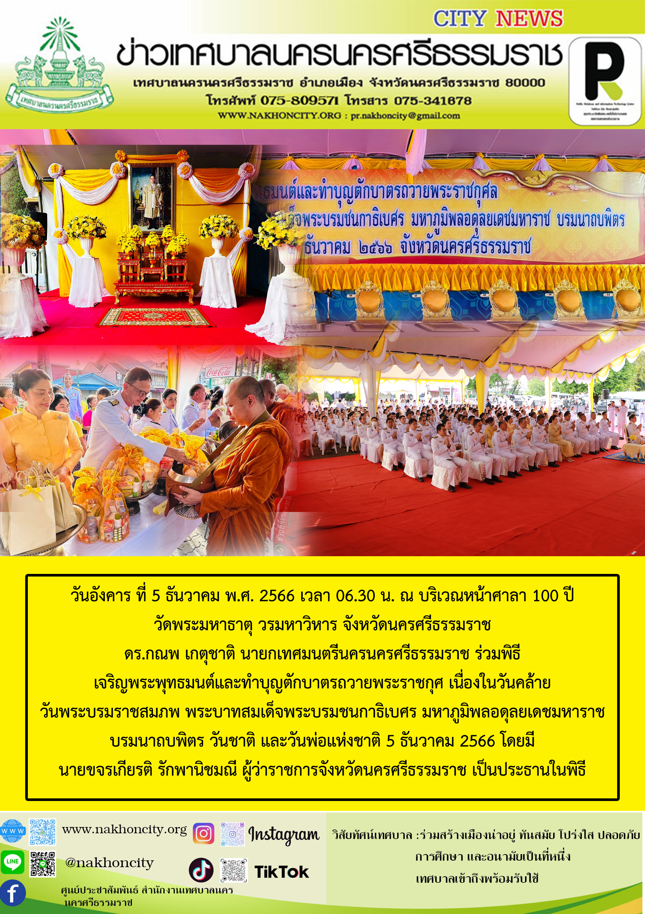 ดร.กณพ เกตุชาติ นายกเทศมนตรีนครนครศรีธรรมราช ร่วมพิธีเจริญพระพุทธมนต์และทำบุญตักบาตรถวายพระราชกุศ เนื่องในวันคล้ายวันพระบรมราชสมภพ พระบาทสมเด็จพระบรมชนกาธิเบศร มหาภูมิพลอดุลยเดชมหาราช บรมนาถบพิตร วันชาติ และวันพ่อแห่งชาติ 5 ธันวาคม 2566 |