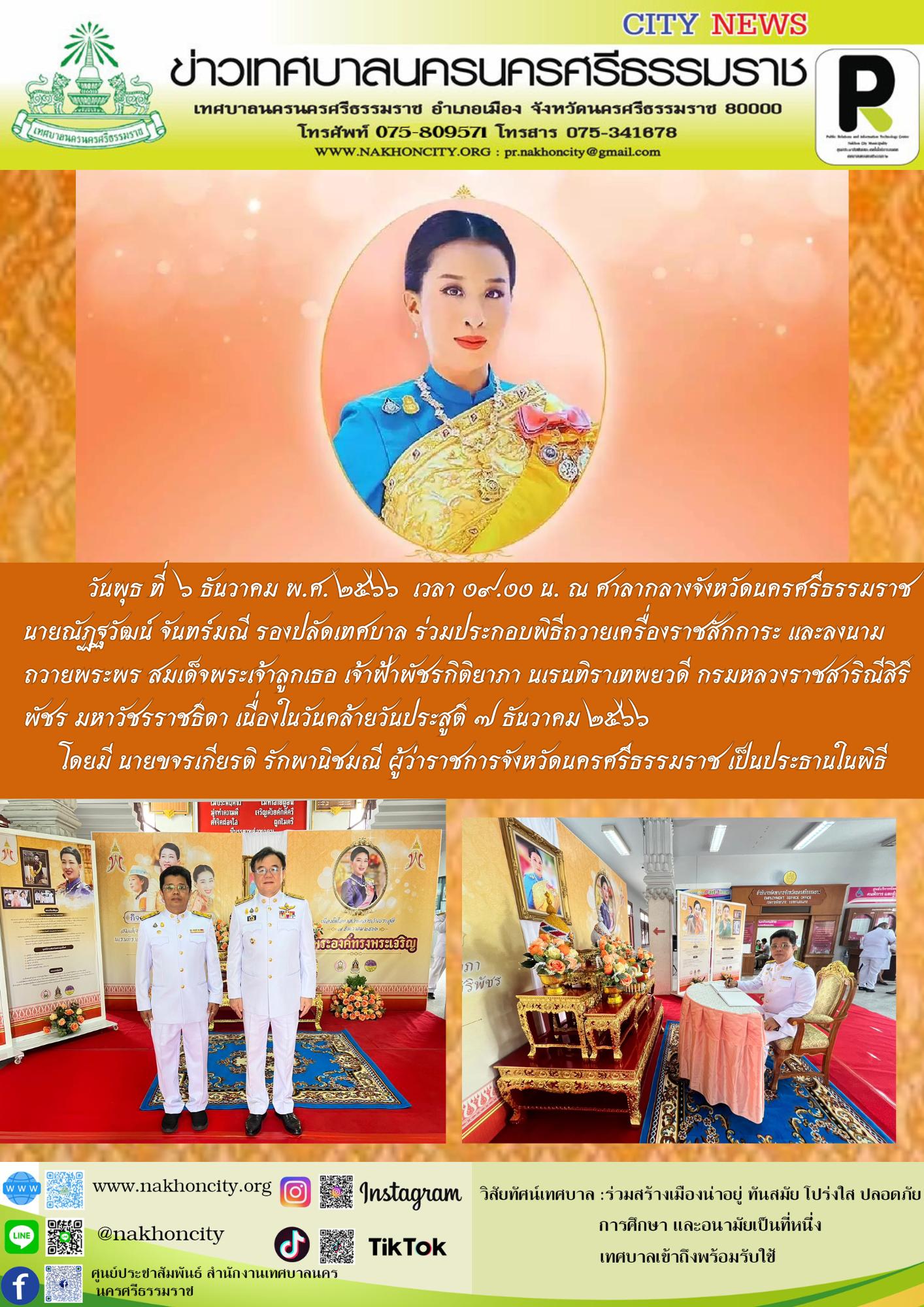 วันพุธ ที่ ๖ ธันวาคม พ.ศ. ๒๕๖๖ เวลา o๙.oo น. ณ ศาลากลางจังหวัดนครศรีธรรมราช นายณัฏฐวัฒน์ จันทร์มณี รองปลัดเทศบาล ร่วมประกอบพิธีถวายเครื่องราชสักการะ และลงนามถวายพระพร สมเด็จพระเจ้าลูกเธอ เจ้าฟ้าพัชรกิติยาภา นเรนทิราเทพยวดี กรมหลวงราชสาริณีสิริพัชร มหาวัชรราชธิดา เนื่องในวันคล้ายวันประสูติ ๗ ธันวาคม ๒๕๖๖ โดยมี นายขจรเกียรติ รักพานิชมณี ผู้ว่าราชการจังหวัดนครศรีธรรมราช เป็นประธานในพิธี |