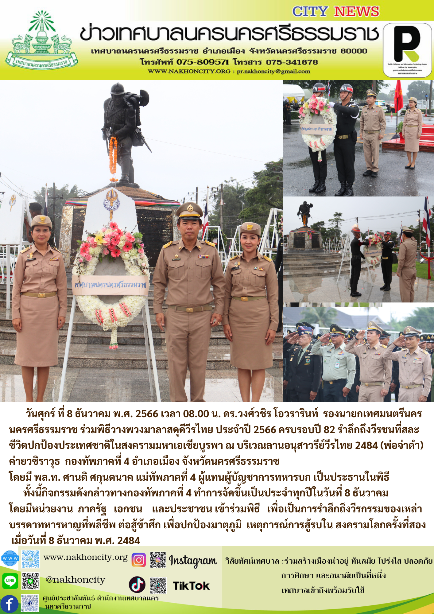 ดร.วงศ์วชิร โอวรารินท์ รองนายกเทศมนตรีนครนครศรีธรรมราช ร่วมพิธีวางพวงมาลาสดุดีวีรไทย ประจำปี 2566 ครบรอบปี 82 รำลึกถึงวีรชนที่สละชีวิตปกป้องประเทศชาติในสงครามมหาเอเชียบูรพา ณ บริเวณลานอนุสาวรีย์วีรไทย 2484 (พ่อจ่าดำ) ค่ายวชิราวุธ กองทัพภาคที่ 4 อำเภอเมือง จังหวัดนครศรีธรรมราช |
