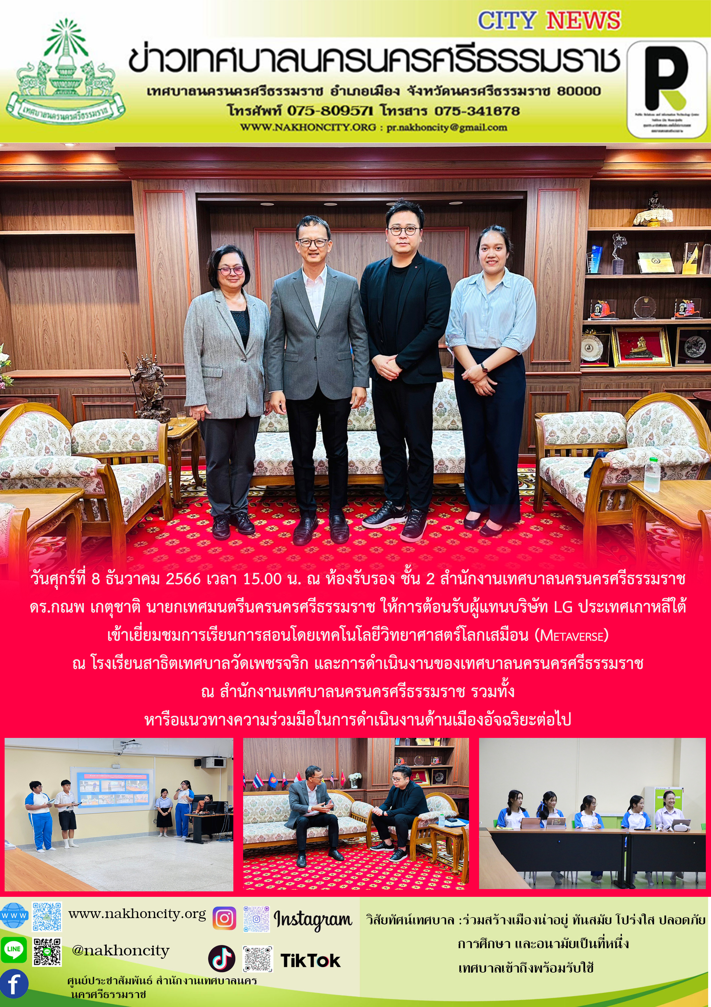 ดร.กณพ เกตุชาติ นายกเทศมนตรีนครนครศรีธรรมราช ให้การต้อนรับผู้แทนบริษัท LG ประเทศเกาหลีใต้ เข้าเยี่ยมชมการเรียนการสอนโดยเทคโนโลยีวิทยาศาสตร์โลกเสมือน (Metaverse) ณ โรงเรียนสาธิตเทศบาลวัดเพชรจริก และการดำเนินงานของเทศบาลนครนครศรีธรรมราช ณ สำนักงานเทศบาลนครนครศรีธรรมราช รวมทั้งหารือแนวทางความร่วมมือในการดำเนินงานด้านเมืองอัจฉริยะต่อไป |