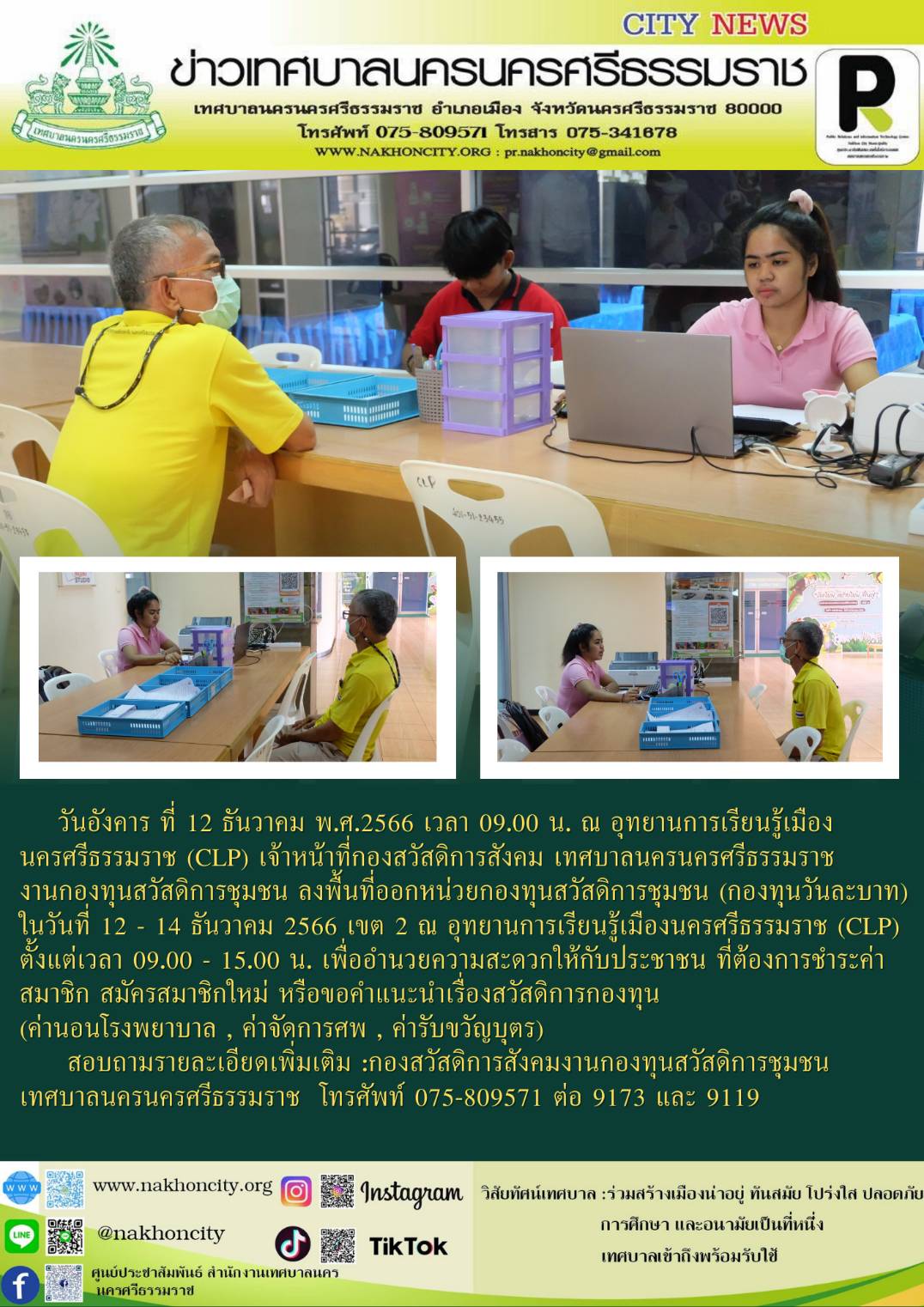 เจ้าหน้าที่กองสวัสดิการสังคม เทศบาลนครนครศรีธรรมราช งานกองทุนสวัสดิการชุมชน ลงพื้นที่ออกหน่วยกองทุนสวัสดิการชุมชน (กองทุนวันละบาท) ในวันที่ 12 - 14 ธันวาคม 2566 เขต 2 ณ อุทยานการเรียนรู้เมืองนครศรีธรรมราช (CLP) |