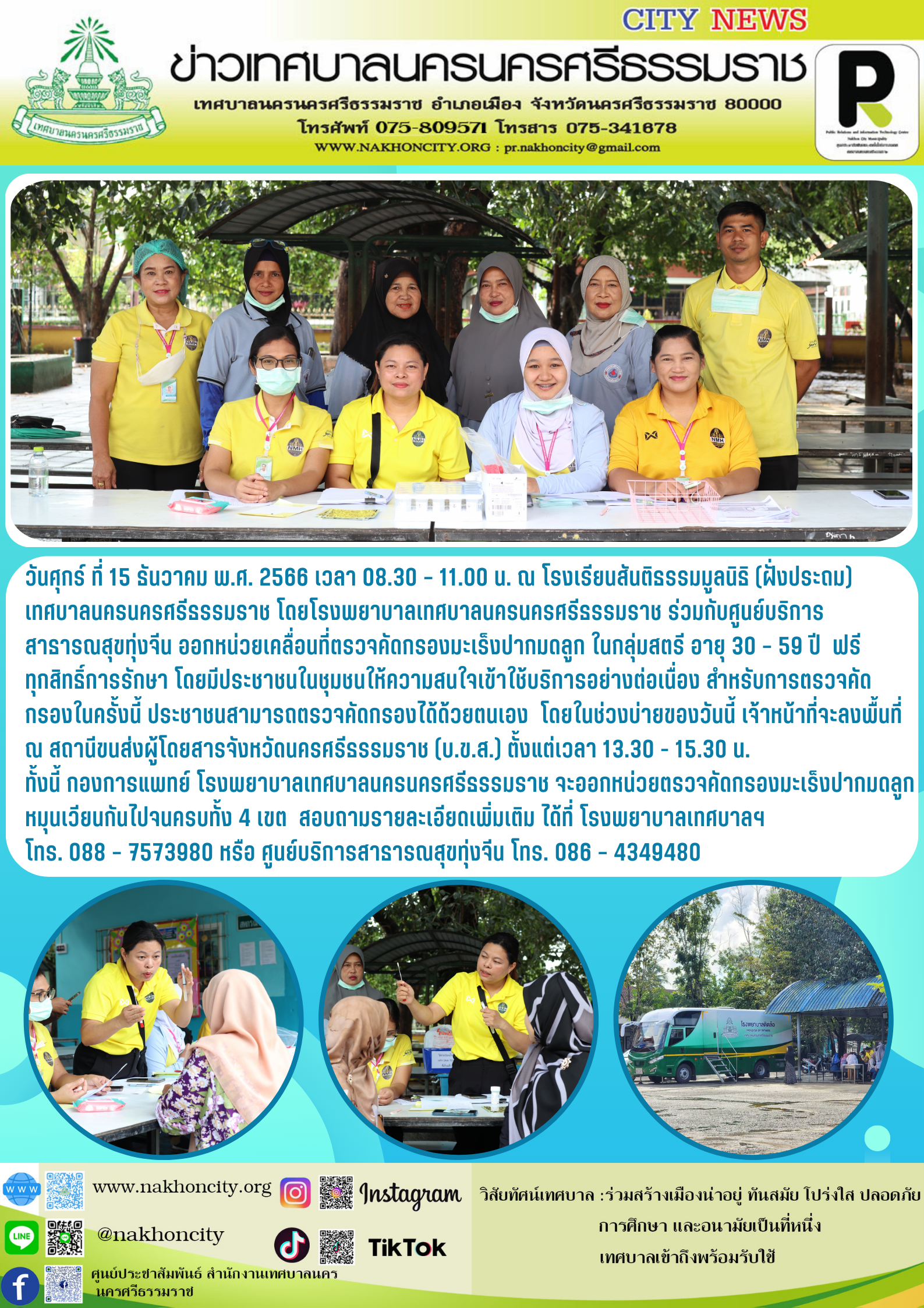 โดยโรงพยาบาลเทศบาลนครนครศรีธรรมราช ร่วมกับศูนย์บริการสาธารณสุขทุ่งจีน ออกหน่วยเคลื่อนที่ตรวจคัดกรองมะเร็งปากมดลูก ในกลุ่มสตรี อายุ 30 – 59 ปี |