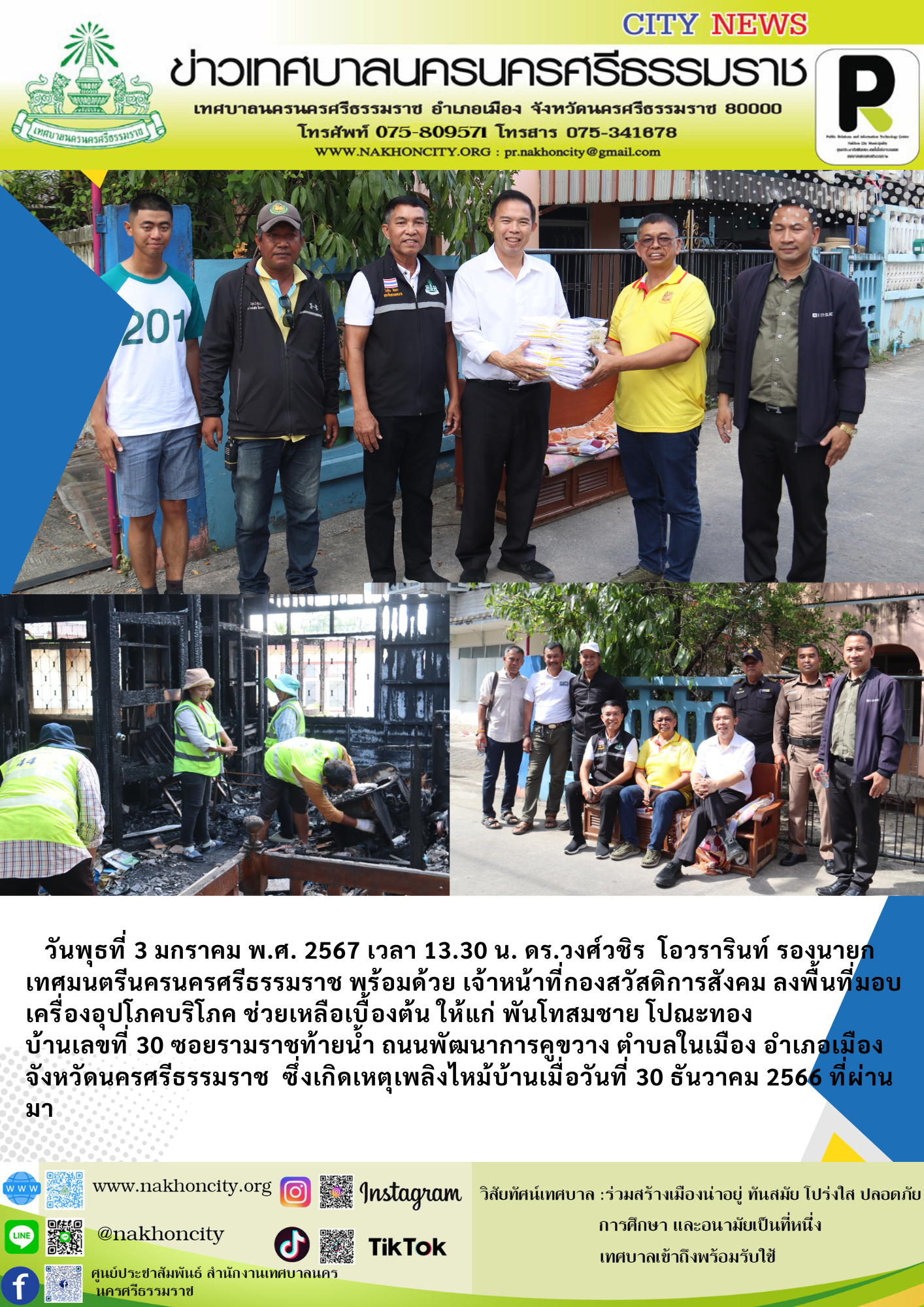 วันพุธที่ 3 มกราคม พ.ศ. 2567 เวลา 13.30 น. ดร.วงศ์วชิร โอวรารินท์ รองนายกเทศมนตรีนครนครศรีธรรมราช พร้อมด้วย เจ้าหน้าที่กองสวัสดิการสังคม ลงพื้นที่มอบ เครื่องอุปโภคบริโภค ช่วยเหลือเบื้องต้น ให้แก่ พันโทสมชาย โปณะทอง บ้านเลขที่ 30 ซอยรามราชท้ายน้ำ ถนนพัฒนาการคูขวาง ตำบลในเมือง อำเภอเมือง จังหวัดนครศรีธรรมราช ซึ่งเกิดเหตุเพลิงไหม้บ้านเมื่อวันที่ 30 ธันวาคม 2566 ที่ผ่านมา |