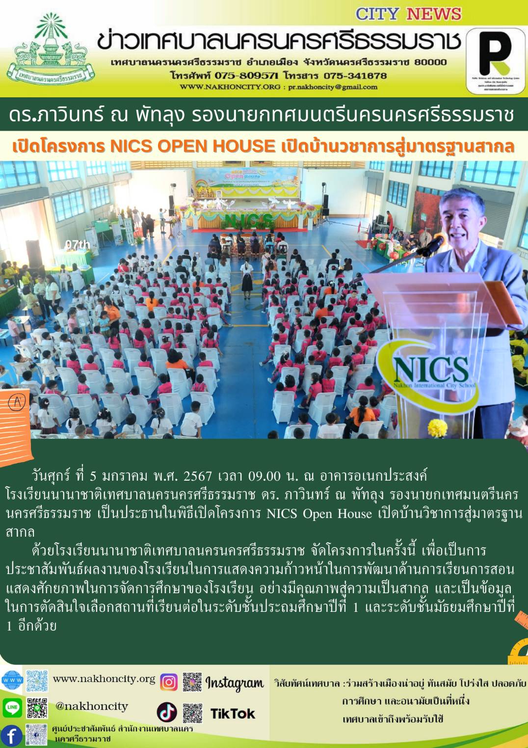 ดร. ภาวินทร์ ณ พัทลุง รองนายกทศมนตรีนครนครศรีธรรมราช เป็นประธานในพิธีเปิดโครงการ NICS Open House เปิดบ้านวชาการสู่มาตรฐานสากล |