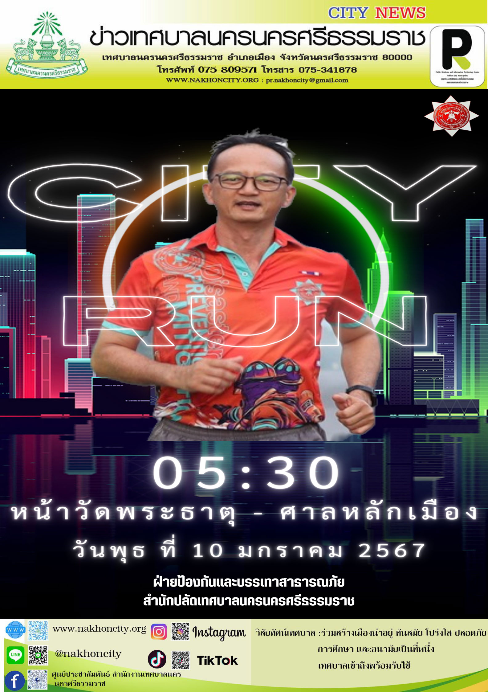 เทศบาลนครนครศรีธรรมราช ภายใต้การนำ ดร.กณพ เกตุชาติ นายกเทศมนตรีนครนครศรีธรรมราช เชิญชวนประชาชน ร่วมวิ่งออกกำลังกาย ทุกเช้าวันพุธ เวลา 05.30 น.เป็นต้นไป กับกิจกรรม "City Run" พร้อมกับ เจ้าหน้าที่ฝ่ายป้องกันและบรรเทาสาธารณภัย และบุคลากร ของ เทศบาลนครนครศรีธรรมราช ซึ่งใน วันพุธที่ 10 มกราคม 2567 นี้ ขอเชิญชวนผู้ที่จะเข้าร่วมกิจกรรมทุกท่าน พบกันที่หน้าวัดพระมหาธาตุวรมหาวิหาร วิ่งออกถนนศรีธรรมโศก วิ่งผ่านศาลหลักเมือง วิ่งผ่านถนนศรีธรรมราช มาถึงหน้าวัดพระมหาธาตุ กิจกรรมการวิ่งในครั้งนี้ จัดขึ้นเพื่อสำรวจเส้นทาง เตรียมความพร้อม ในด้านการปฏิบัติงาน ให้กับเจ้าหน้าที่ฝ่ายป้องกันและบรรเทาสาธารณภัย และเป็นการส่งเสริมการออกกำลังกาย ให้กับประชาชน