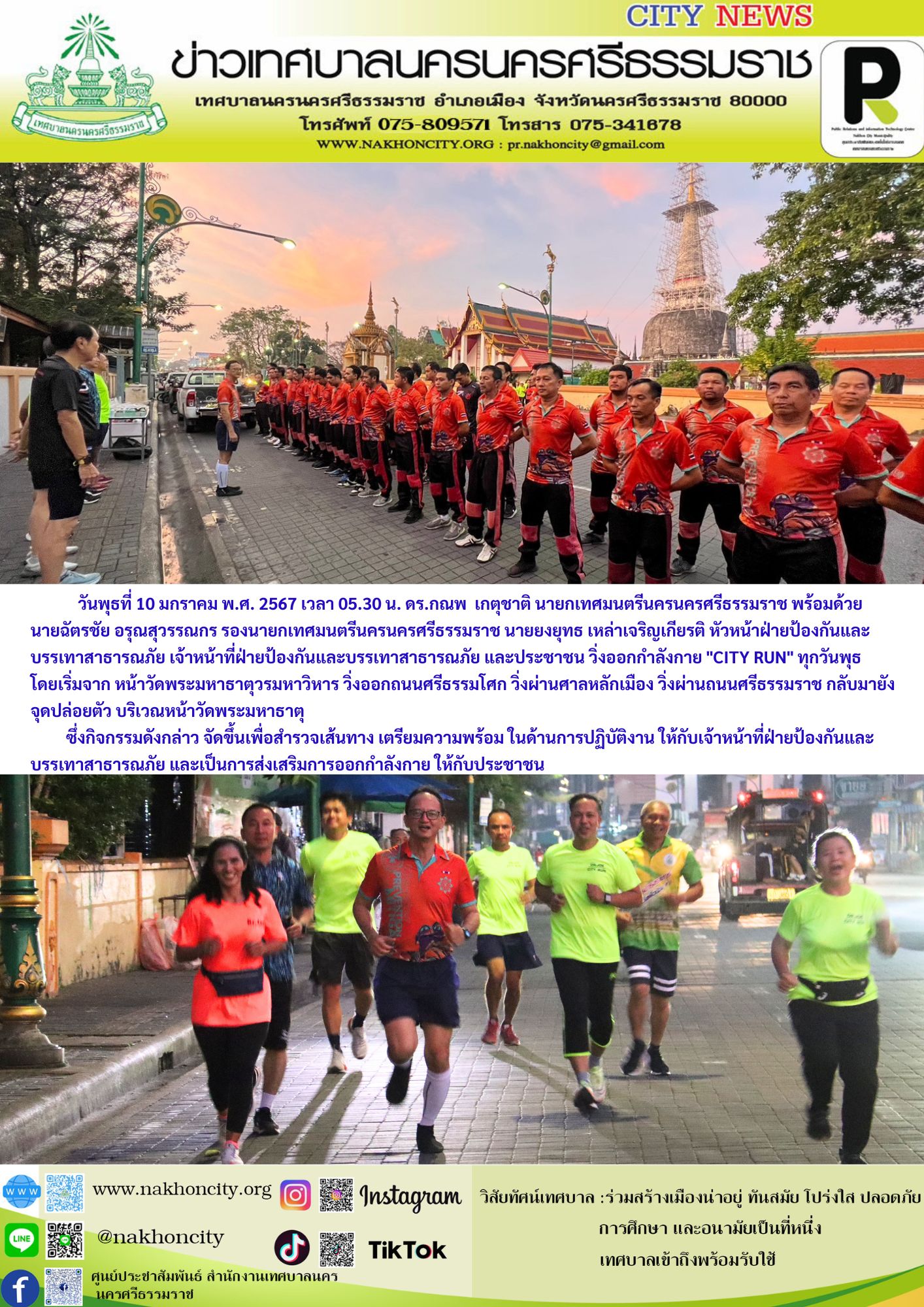 ดร.กณพ เกตุชาติ นายกเทศมนตรีนครนครศรีธรรมราช พร้อมด้วย นายฉัตรชัย อรุณสุวรรณกร รองนายกเทศมนตรีนครนครศรีธรรมราช นายยงยุทธ เหล่าเจริญเกียรติ หัวหน้าฝ่ายป้องกันและบรรเทาสาธารณภัย เจ้าหน้าที่ฝ่ายป้องกันและบรรเทาสาธารณภัย และประชาชน วิ่งออกกำลังกาย "CITY RUN" ทุกวันพุธ |