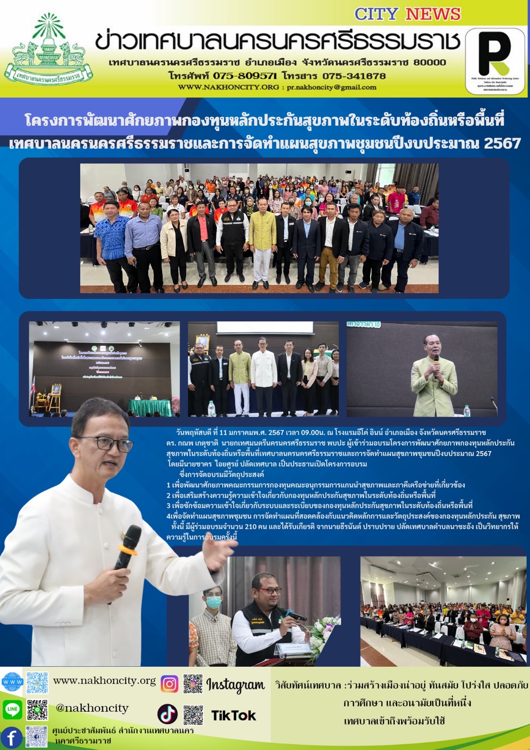 ดร. กณพ เกตุชาติ นายกเทศมนตรีนครนครศรีธรรมราช พบปะ ผู้เข้าร่วมอบรมโครงการพัฒนาศักยภาพกองทุนหลักประกันสุขภาพในระดับท้องถิ่นหรือพื้นที่เทศบาลนครนครศรีธรรมราชและการจัดทำแผนสุขภาพชุมชนปีงบประมาณ 2567 |