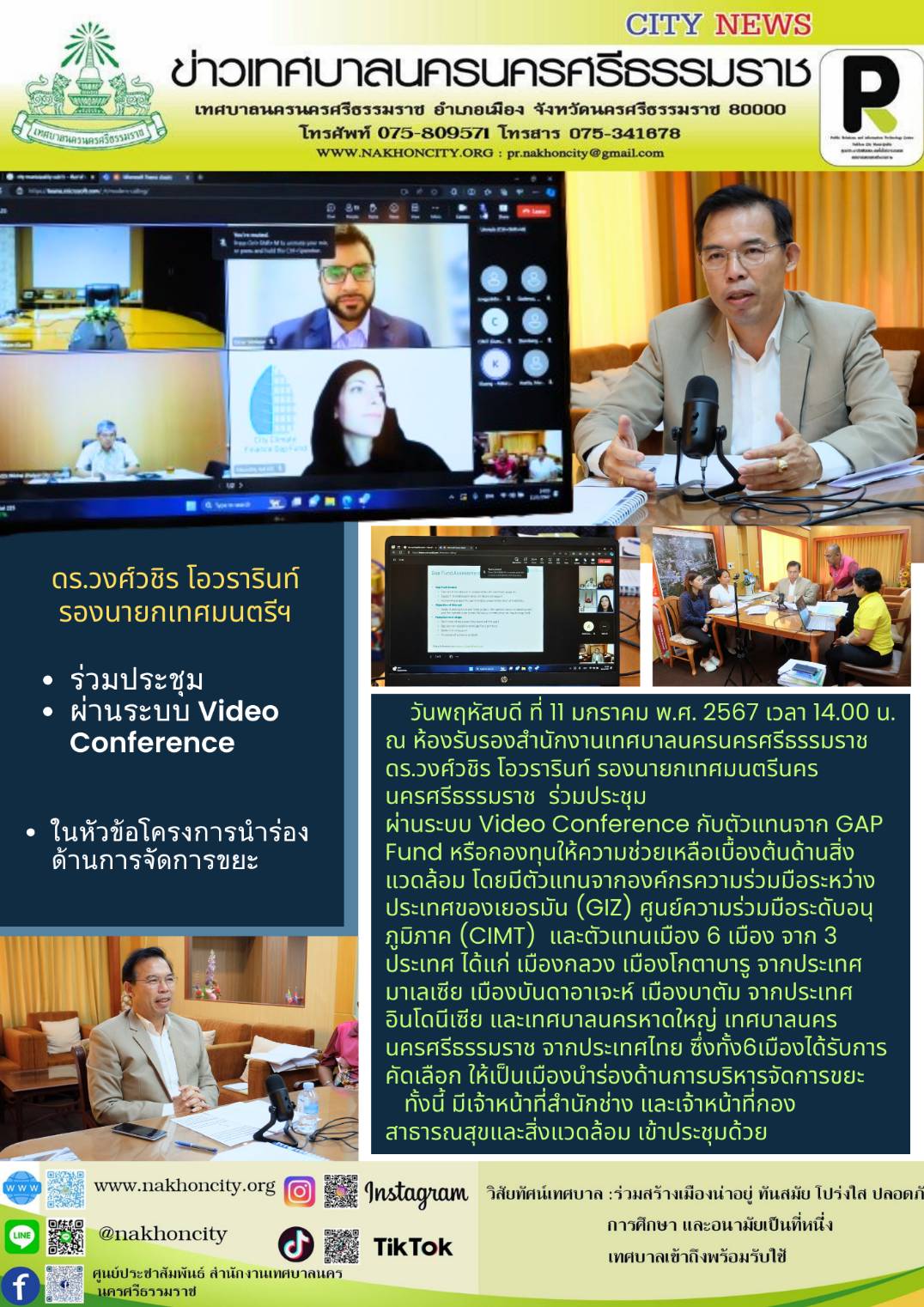 ดร.วงศ์วชิร โอวรารินท์ รองนายกเทศมนตรีนครนครศรีธรรมราช ร่วมประชุม ผ่านระบบ Video Conference ในหัวข้อโครงการนำร่องด้านการจัดการขยะ |