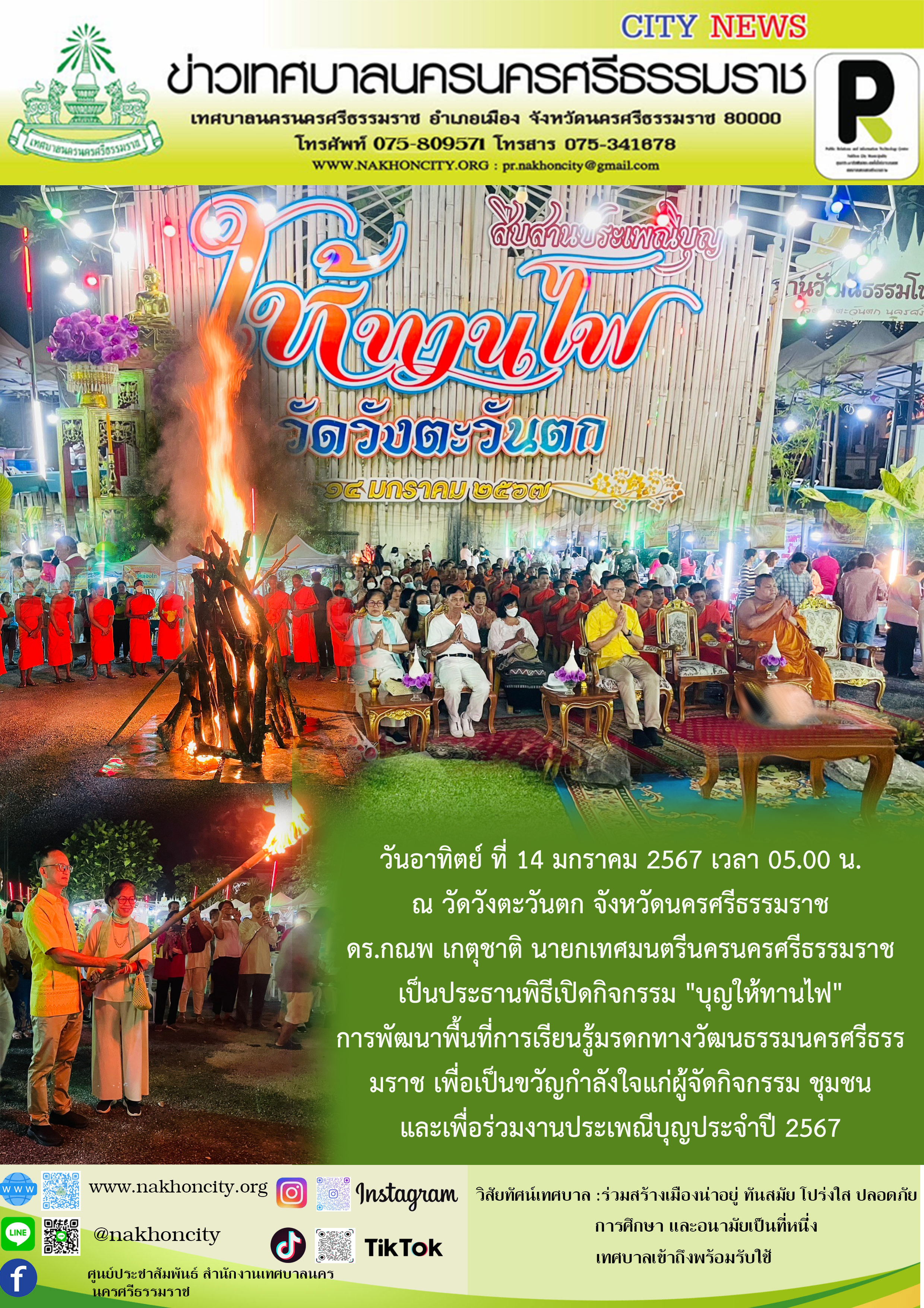 ดร.กณพ เกตุชาติ นายกเทศมนตรีนครนครศรีธรรมราช เป็นประธานพิธีเปิดกิจกรรม "บุญให้ทานไฟ" การพัฒนาพื้นที่การเรียนรู้มรดกทางวัฒนธรรมนครศรีธรรมราช เพื่อเป็นขวัญกำลังใจแก่ผู้จัดกิจกรรม ชุมชน และเพื่อร่วมงานประเพณีบุญประจำปี 2567 |