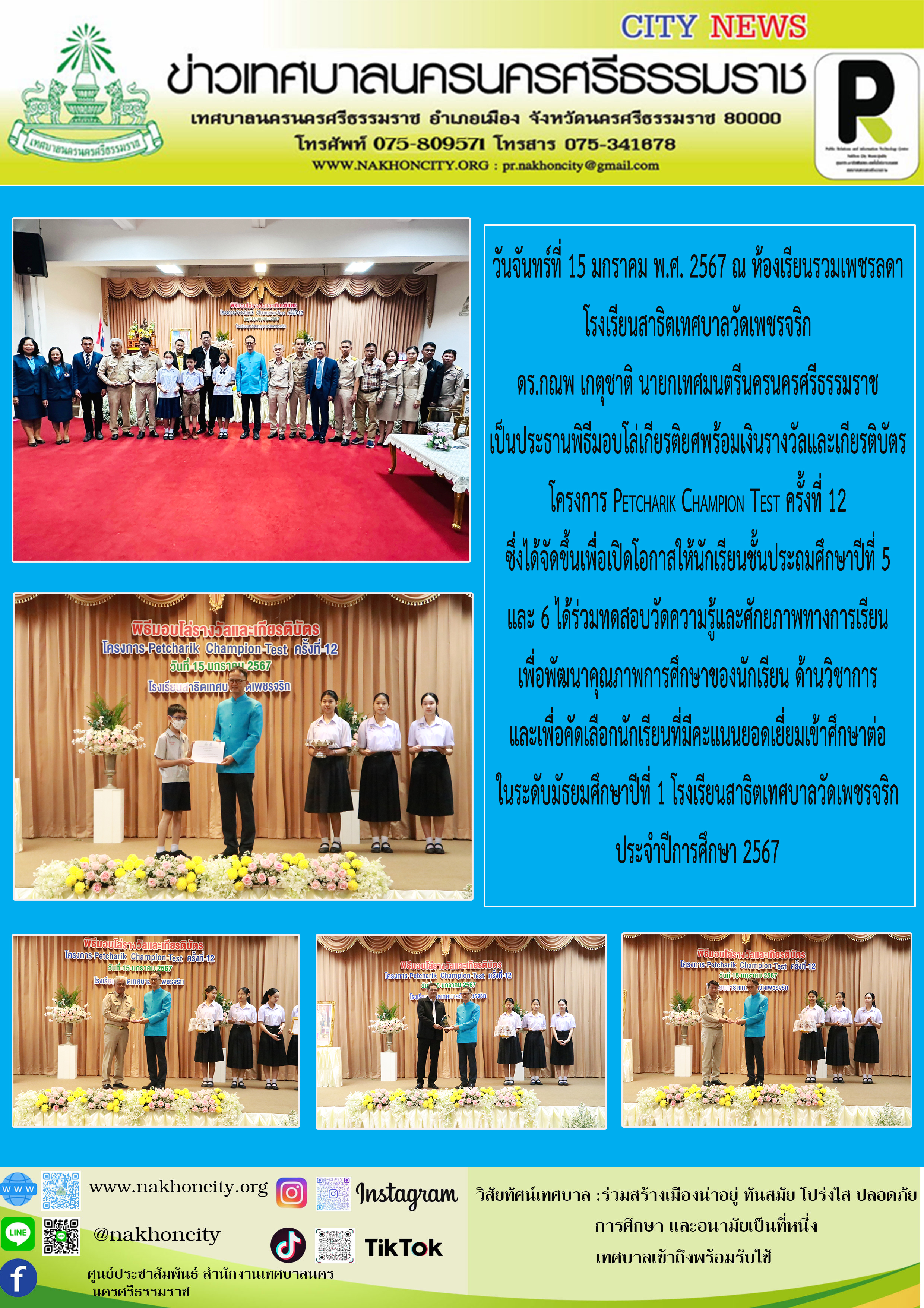 ดร.กณพ เกตุชาติ นายกเทศมนตรีนครนครศรีธรรมราช เป็นประธานพิธีมอบโล่เกียรติยศพร้อมเงินรางวัลและเกียรติบัตร โครงการ Petcharik Champion Test ครั้งที่ 12 ซึ่งได้จัดขึ้นเพื่อเปิดโอกาสให้นักเรียนชั้นประถมศึกษาปีที่ 5 และ 6 ได้ร่วมทดสอบวัดความรู้และศักยภาพทางการเรียน เพื่อพัฒนาคุณภาพการศึกษาของนักเรียน ด้านวิชาการและเพื่อคัดเลือกนักเรียนที่มีคะแนนยอดเยี่ยมเข้าศึกษาต่อในระดับมัธยมศึกษาปีที่ 1 โรงเรียนสาธิตเทศบาลวัดเพชรจริก ประจำปีการศึกษา 2567 |