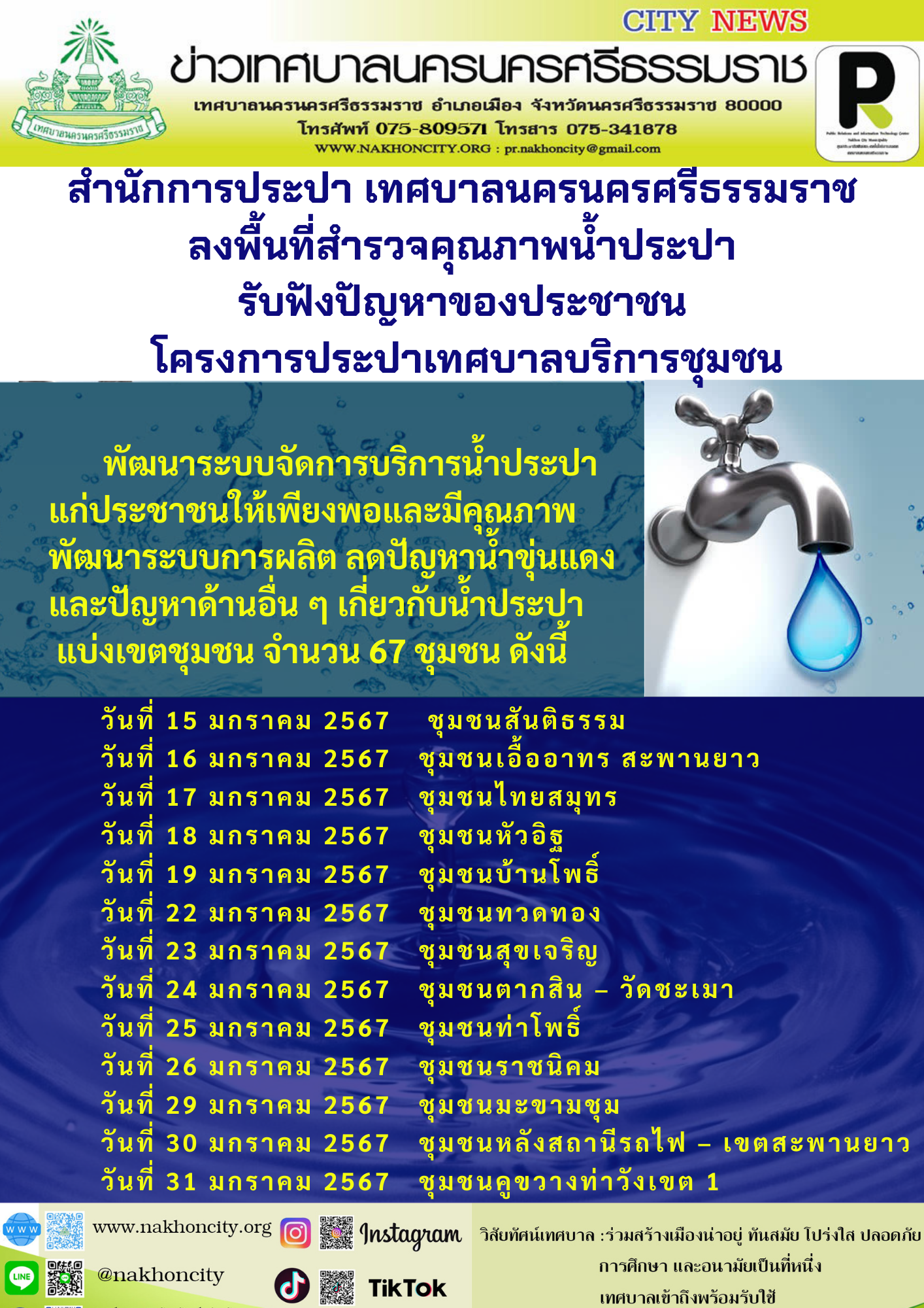 เทศบาลนครนครศรีธรรมราช ภายใต้การนำของ ดร.กณพ เกตุชาติ นายกเทศมนตรีนครนครศรีธรรมราช โดยสำนักการประปา เทศบาลนครนครศรีธรรมราช จัดทำโครงการประปาเทศบาลบริการชุมชน ประจำปีงบประมาณ 2567 สำนักการประปา เทศบาลนครนครศรีธรรมราช พัฒนาระบบจัดการบริการน้ำประปาแก่ประชาชนให้เพียงพอและมีคุณภาพ พัฒนาระบบการผลิต ลดปัญหาน้ำขุ่นแดงและปัญหาด้านอื่น ๆ เกี่ยวกับน้ำประปา ลงพื้นที่สำรวจคุณภาพน้ำประปา รับฟังปัญหาต่าง ๆ เกี่ยวกับระบบประปา แบ่งเขตชุมชน จำนวน 67 ชุมชน เริ่มต้นเดือนมกราคม 2567 จำนวน 13 ชุมชน ตั้งแต่เวลา 15.30 น. ระหว่างวันที่ 15 -31 มกราคม 2567 ณ ที่ทำการชุมชนตามกำหนด ดังนี้ วันที่ 15 มกราคม 2567 ชุมชนสันติธรรม วันที่ 16 มกราคม 2567 ชุมชนเอื้ออาทร สะพานยาว วันที่ 17 มกราคม 2567 ชุมชนไทยสมุทร วันที่ 18 มกราคม 2567 ชุมชนหัวอิฐ วันที่ 19 มกราคม 2567 ชุมชนบ้านโพธิ์ วันที่ 22 มกราคม 2567 ชุมชนทวดทอง วันที่ 23 มกราคม 2567 ชุมชนสุขเจริญ วันที่ 24 มกราคม 2567 ชุมชนตากสิน – วัดชะเมา วันที่ 25 มกราคม 2567 ชุมชนท่าโพธิ์ วันที่ 26 มกราคม 2567 ชุมชนราชนิคม วันที่ 29 มกราคม 2567 ชุมชนมะขามชุม วันที่ 30 มกราคม 2567 ชุมชนหลังสถานีรถไฟ – เขตสะพานยาว วันที่ 31 มกราคม 2567 ชุมชนคูขวางท่าวังเขต 1 สอบถามรายละเอียดเพิ่มเติมได้ที่ สำนักการประปา เทศบาลนครนครศรีธรรมราช โทร 075-809571 ต่อ 9120,9121 และเบอร์ 075-356282 โรงกรองน้ำประตูชัย