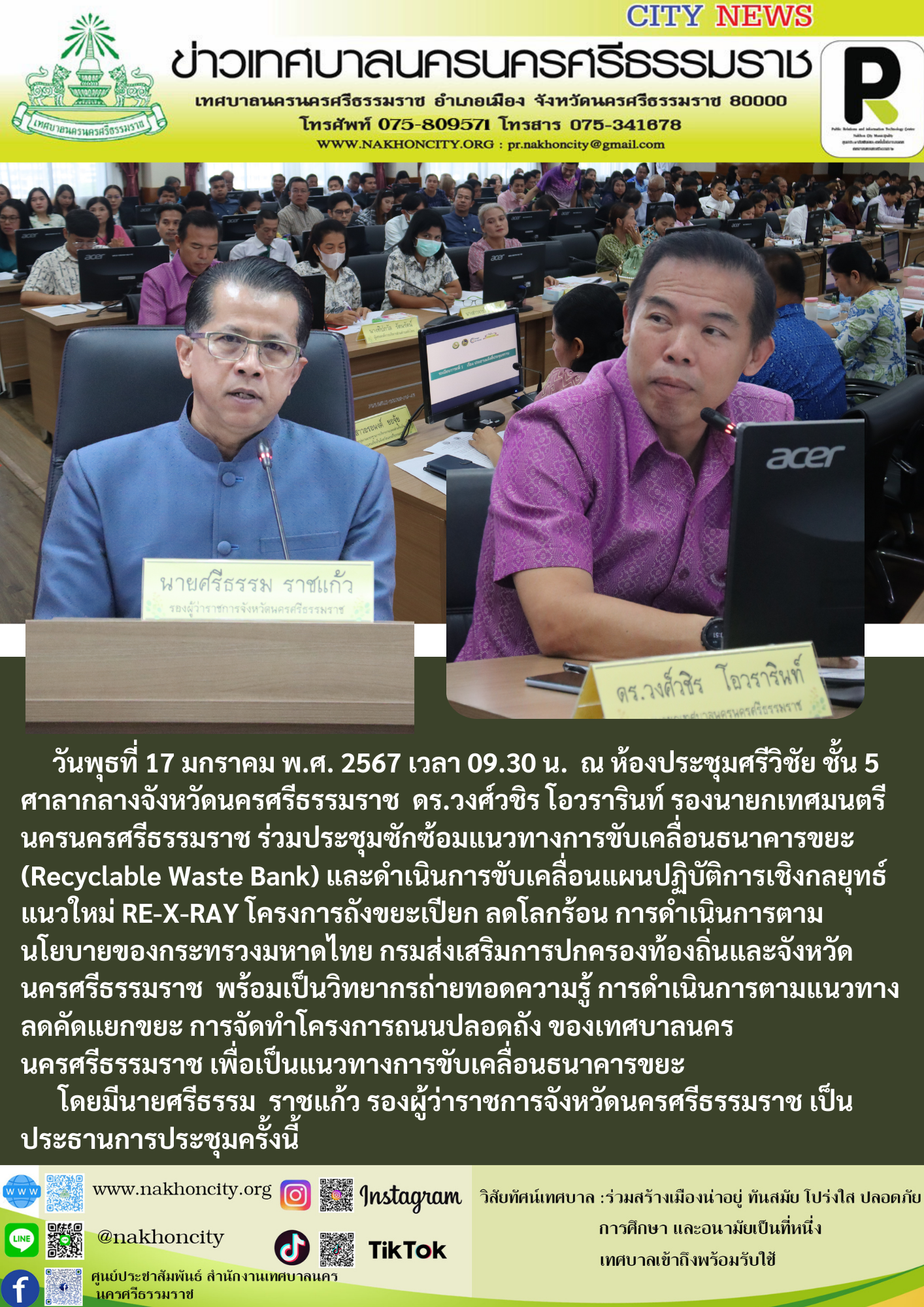 ร.วงศ์วชิร โอวรารินท์ รองนายกเทศมนตรีนครนครศรีธรรมราช ร่วมประชุมซักซ้อมแนวทางการขับเคลื่อนธนาคารขยะ (Recyclable Waste Bank) และดำเนินการขับเคลื่อนแผนปฏิบัติการเชิงกลยุทธ์แนวใหม่ RE-X-RAY โครงการถังขยะเปียก ลดโลกร้อน การดำเนินการตามนโยบายของกระทรวงมหาดไทย กรมส่งเสริมการปกครองท้องถิ่นและจังหวัดนครศรีธรรมราช |