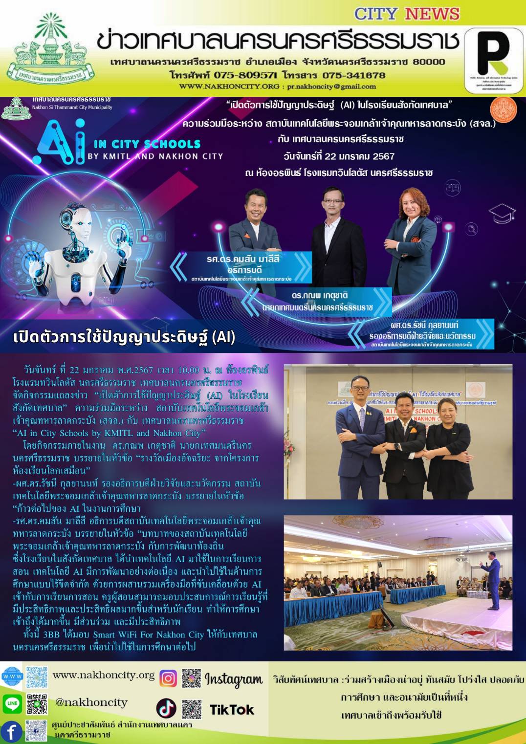 วันจันทร์ ที่ 22 มกราคม พ.ศ.2567 เวลา 10.00 น. ณ ห้องอรพินธ์ โรงแรมทวินโลตัส นครศรีธรรมราช เทศบาลนครนครศรีธรรมราช จัดกิจกรรมแถลงข่าว “เปิดตัวการใช้ปัญญาประดิษฐ์ (AI) ในโรงเรียนสังกัดเทศบาล” ความร่วมมือระหว่าง สถาบันเทคโนโลยีพระจอมเกล้าเจ้าคุณทหารลาดกระบัง (สจล.) กับ เทศบาลนครนครศรีธรรมราช “AI in City Schools by KMITL and Nakhon City” โดยกิจกรรมภายในงาน ดร.กณพ เกตุชาติ นายกเทศมนตรีนครนครศรีธรรมราช บรรยายหัวข้อ “รางวัลเมืองอัจฉริยะ จากโครงการห้องเรียนโลกเสมือน”