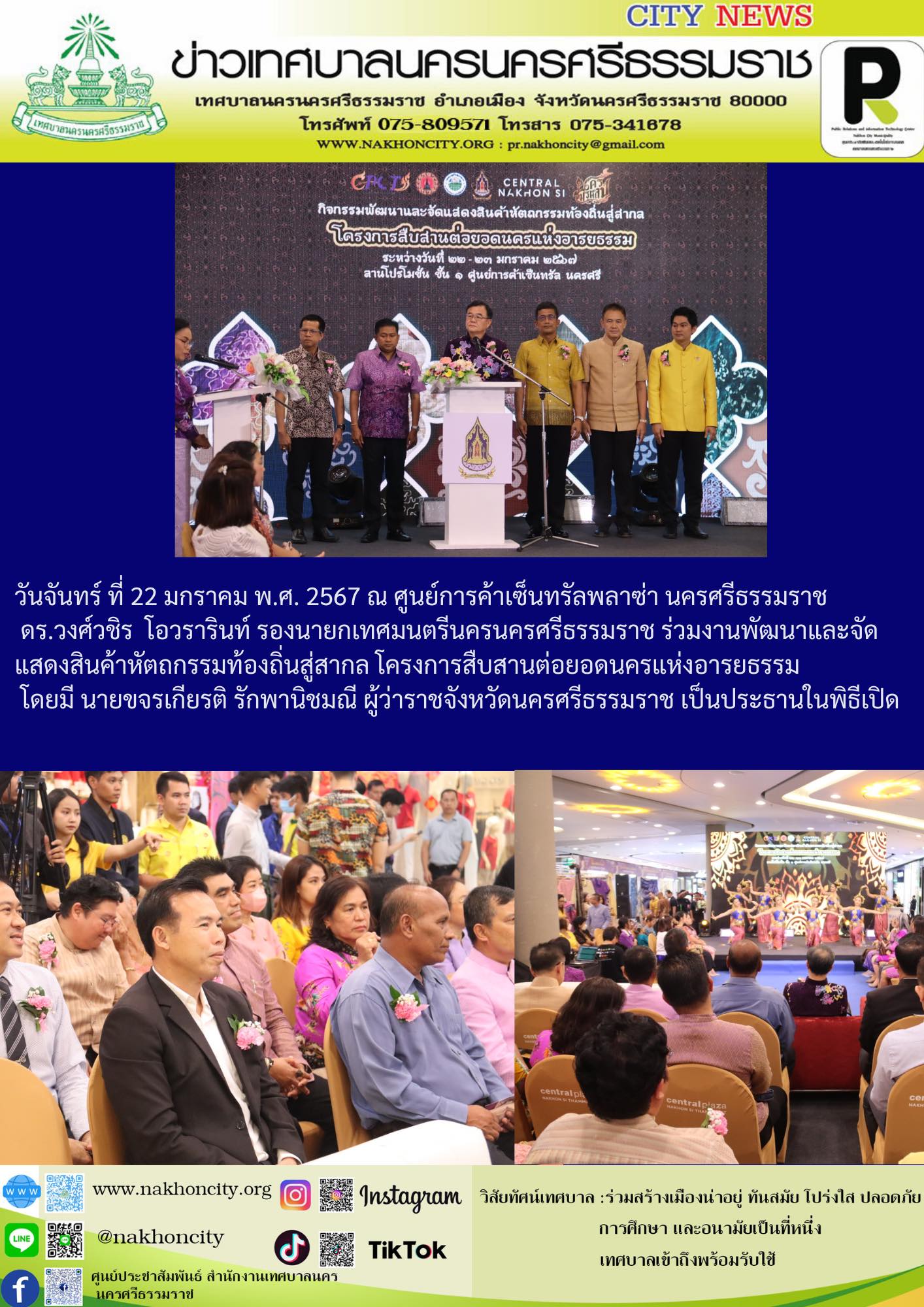 วันจันทร์ ที่ 22 มกราคม พ.ศ. 2567 ณ ศูนย์การค้าเซ็นทรัลพลาซ่า นครศรีธรรมราช ดร.วงศ์วชิร โอวรารินท์ รองนายกเทศมนตรีนครนครศรีธรรมราช ร่วมงานพัฒนาและจัดแสดงสินค้าหัตถกรรมท้องถิ่นสู่สากล โครงการสืบสานต่อยอดนครแห่งอารยธรรม โดยมี นายขจรเกียรติ รักพานิชมณี ผู้ว่าราชจังหวัดนครศรีธรรมราช เป็นประธานในพิธีเปิด สล็อต สล็อตออนไลน์ thaicasinobin |