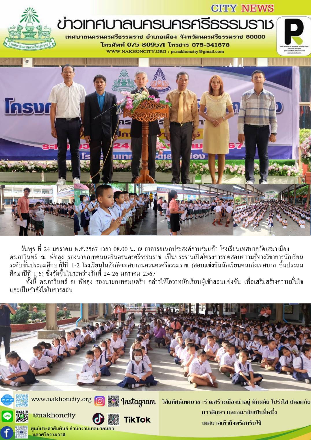 ดร.ภาวินทร์ ณ พัทลุง รองนายกเทศมนตรีนครนครศรีธรรมราช เป็นประธานเปิดโครงการทดสอบความรู้ทางวิชาการนักเรียนระดับชั้นประถมศึกษาปีที่ 1-2 โรงเรียนในสังกัดเทศบาลนครนครศรีธรรมราช |