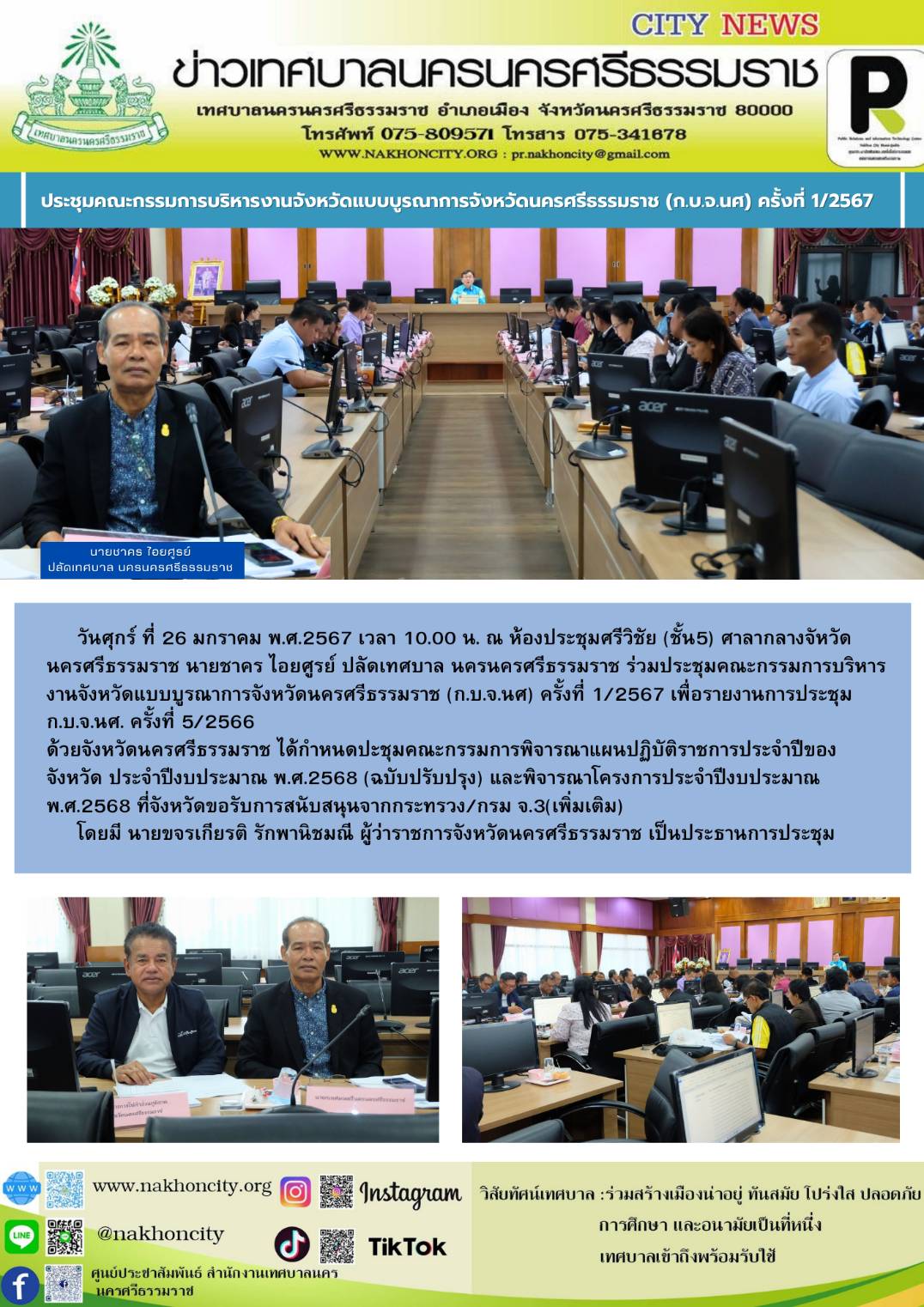 นายชาคร ไอยศูรย์ ปลัดเทศบาล นครนครศรีธรรมราช ร่วมประชุมคณะกรรมการบริหารงานจังหวัดแบบบูรณาการจังหวัดนครศรีธรรมราช (ก.บ.จ.นศ) ครั้งที่ 1/2567 |