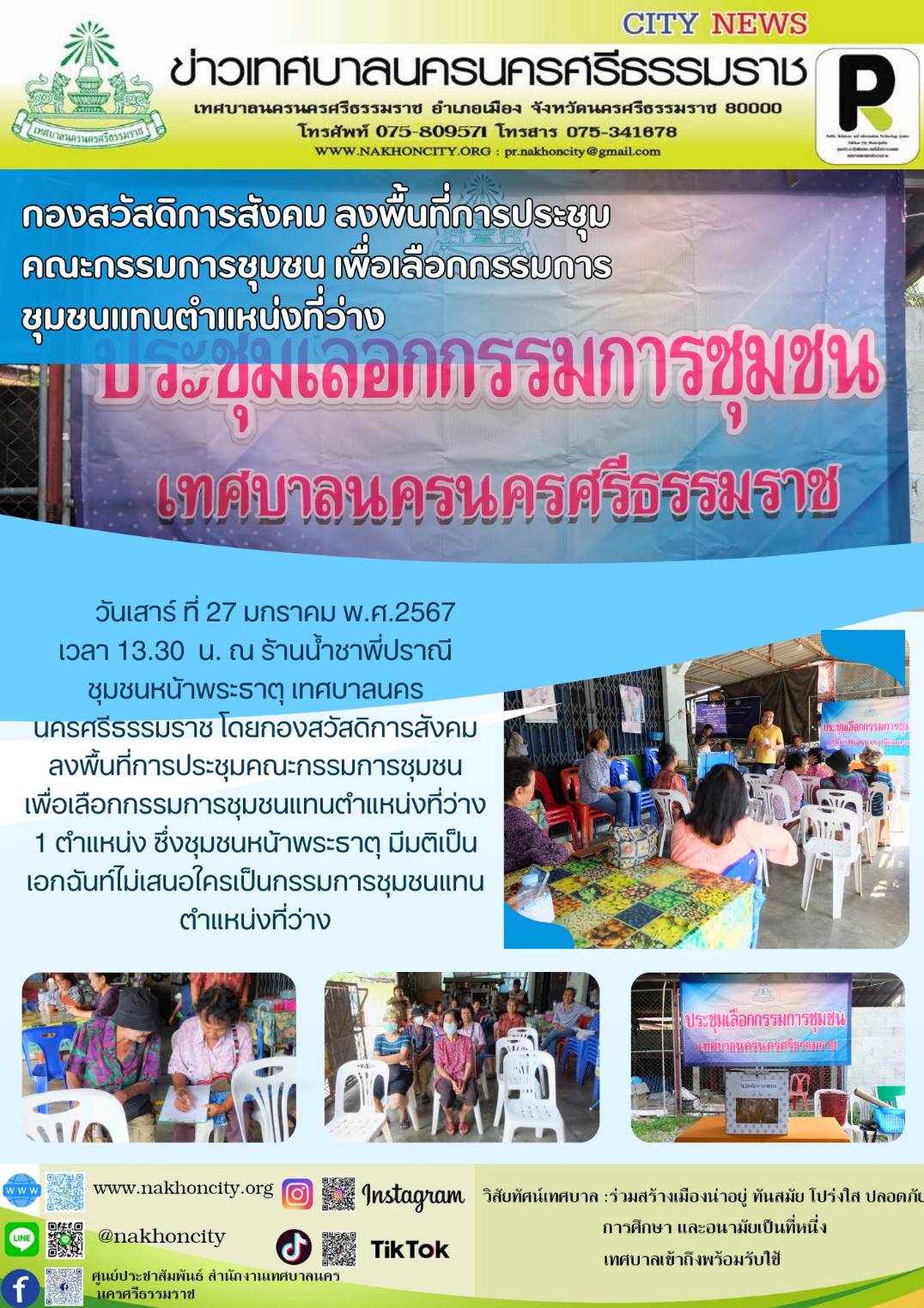 วันเสาร์ ที่ 27 มกราคม พ.ศ.2567 เวลา 13.30 น. ณ ร้านน้ำชาพี่ปราณี ชุมชนหน้าพระธาตุ เทศบาลนครนครศรีธรรมราช โดยกองสวัสดิการสังคม ลงพื้นที่การประชุมคณะกรรมการชุมชน เพื่อเลือกกรรมการชุมชนแทนตำแหน่งที่ว่าง 1 ตำแหน่ง ซึ่งชุมชนหน้าพระธาตุ มีมติเป็นเอกฉันท์ไม่เสนอใครเป็นกรรมการชุมชนแทนตำแหน่งที่ว่าง ……… ภาพ//ข่าว//จันทร์จิรา