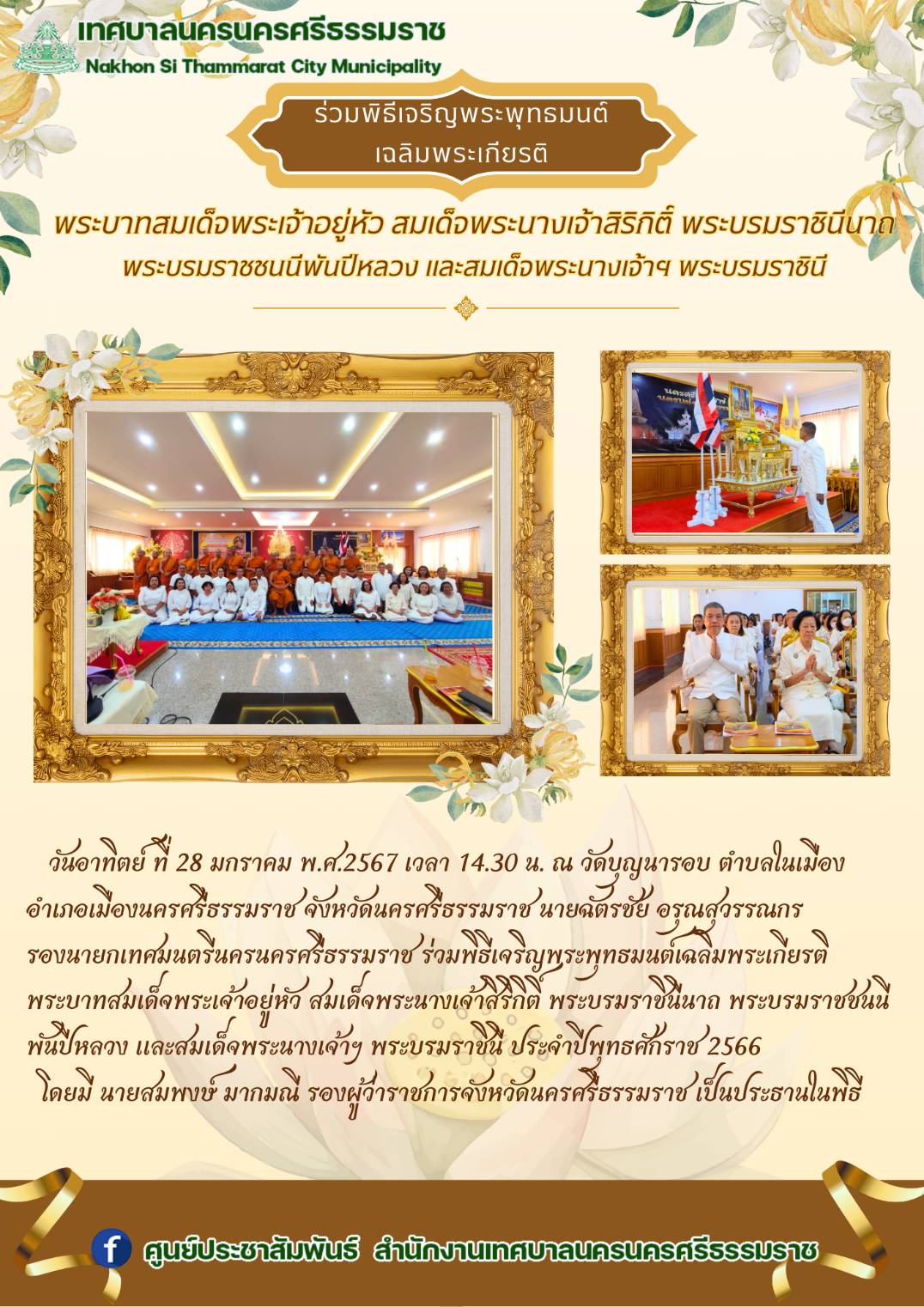 วันอาทิตย์ ที่ 28 มกราคม พ.ศ.2567 เวลา 14.30 น. ณ วัดบุญนารอบ ตำบลในเมือง อำเภอเมืองนครศรีธรรมราช จังหวัดนครศรีธรรมราช นายฉัตรชัย อรุณสุวรรณกร รองนายกเทศมนตรีนครนครศรีธรรมราช ร่วมพิธีเจริญพระพุทธมนต์เฉลิมพระเกียรติ พระบาทสมเด็จพระเจ้าอยู่หัว สมเด็จพระนางเจ้าสิริกิติ์ พระบรมราชินีนาถ พระบรมราชชนนีพันปีหลวง และสมเด็จพระนางเจ้าฯ พระบรมราชินี ประจำปีพุทธศักราช 2566 โดยมี นายสมพงษ์ มากมณี รองผู้ว่าราชการจังหวัดนครศรีธรรมราช เป็นประธานในพิธี ........... ภาพ//ข่าว//จันทร์จิรา |