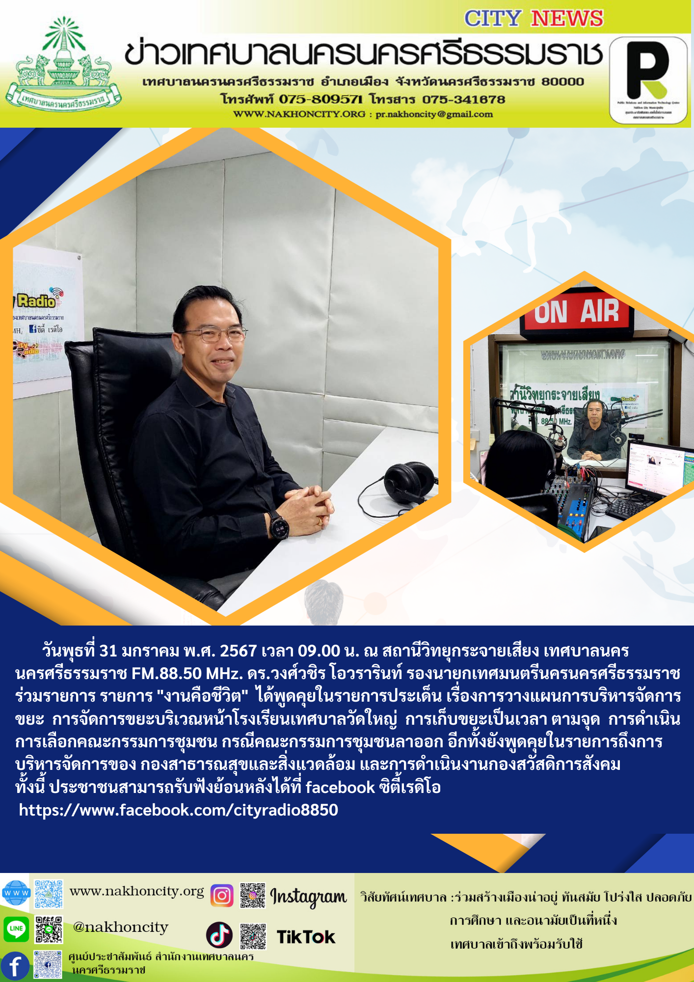 ดร.วงศ์วชิร โอวรารินท์ รองนายกเทศมนตรีนครนครศรีธรรมราช ร่วมรายการ รายการ "งานคือชีวิต" ทางสถานีวิทยุกระจายเสียง เทศบาลนครนครศรีธรรมราช FM.88.50 MHz. |
