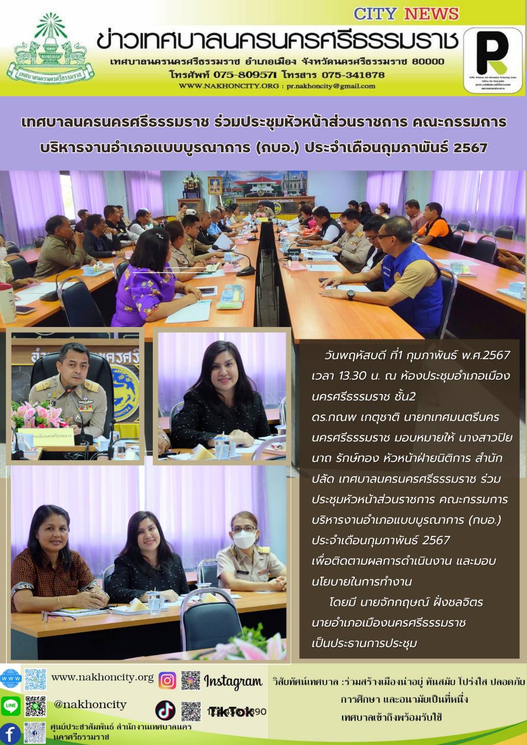 เทศบาลนครนครศรีธรรมราช ร่วมประชุมหัวหน้าส่วนราชการ คณะกรรมการบริหารงานอำเภอแบบบูรณาการ (กบอ.) ประจำเดือนกุมภาพันธ์ 2567 |