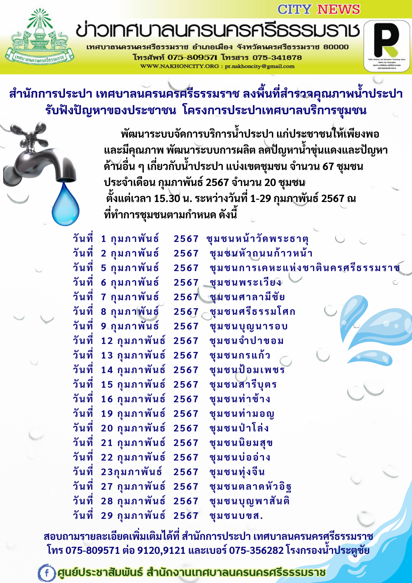 สำนักการประปา เทศบาลนครนครศรีธรรมราช จัดทำโครงการประปาเทศบาลบริการชุมชน ประจำปีงบประมาณ 2567 ลงพื้นที่สำรวจคุณภาพน้ำประปา รับฟังปัญหาต่าง ๆ เกี่ยวกับระบบประปา แบ่งเขตชุมชน จำนวน 67 ชุมชนเดือนกุมภาพันธ์ 2567 จำนวน 20 ชุมชน |