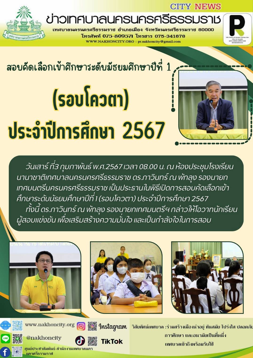 ดร.ภาวินทร์ ณ พัทลุง รองนายกเทศมนตรีนครนครศรีธรรมราช เป็นประธานในพิธีเปิดการสอบคัดเลือกเข้าศึกษาระดับมัธยมศึกษาปีที่ 1 (รอบโควตา) ประจำปีการศึกษา 2567 |
