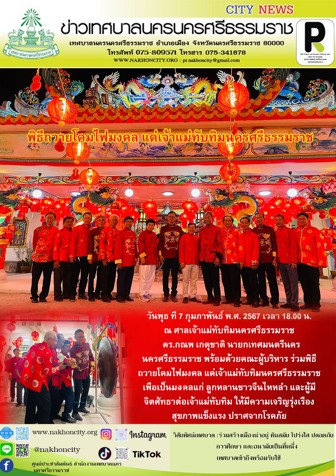 ดร.กณพ เกตุชาติ นายกเทศมนตรีนครนครศรีธรรมราช พร้อมด้วยคณะผู้บริหาร ร่วมพิธีถวายโคมไฟมงคล แด่เจ้าแม่ทับทิมนครศรีธรรมราช |