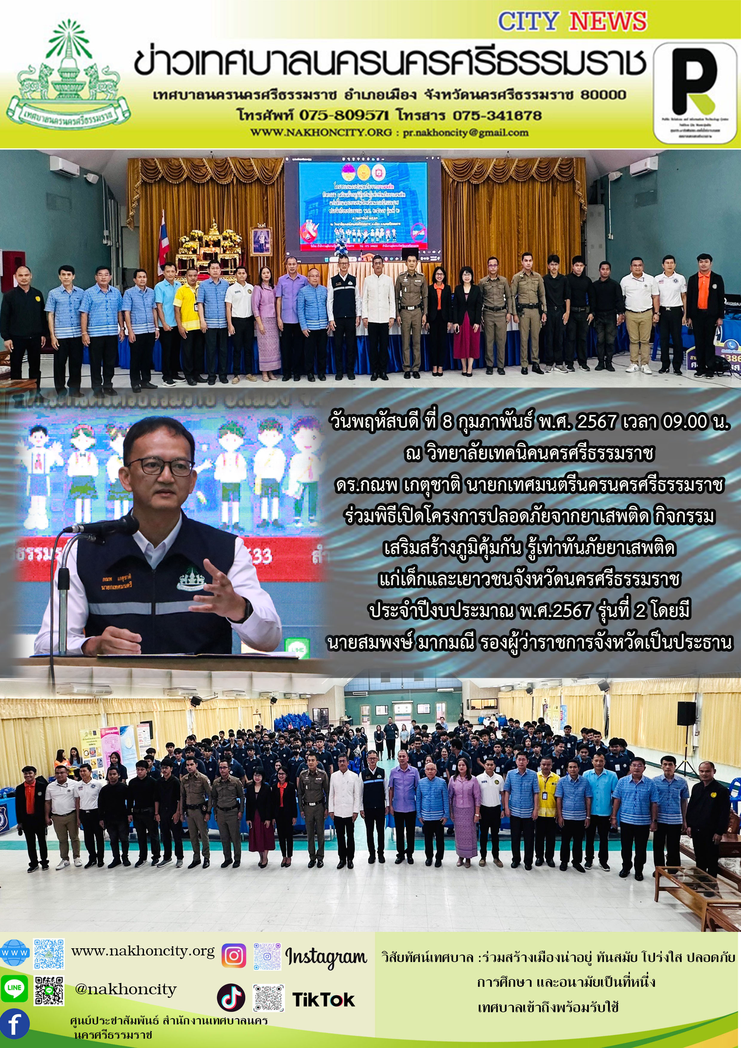 ดร.กณพ เกตุชาติ นายกเทศมนตรีนครนครศรีธรรมราช ร่วมพิธีเปิดโครงการปลอดภัยจากยาเสพติด กิจกรรมเสริมสร้างภูมิคุ้มกัน รู้เท่าทันภัยยาเสพติดแก่เด็กและเยาวชนจังหวัดนครศรีธรรมราช ประจำปีงบประมาณ พ.ศ.2567 รุ่นที่ 2 |